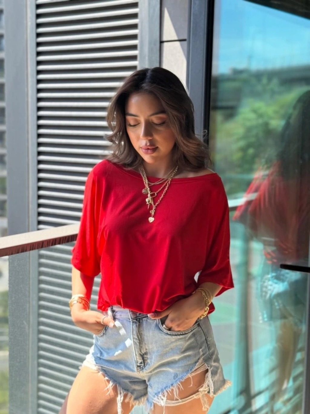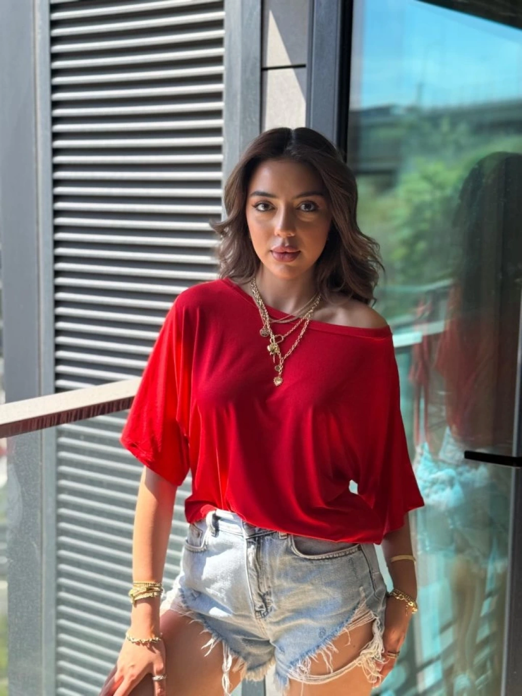 Kadın Tek Omuzu Açık Kısa Kollu Salaş Viskon Bluz