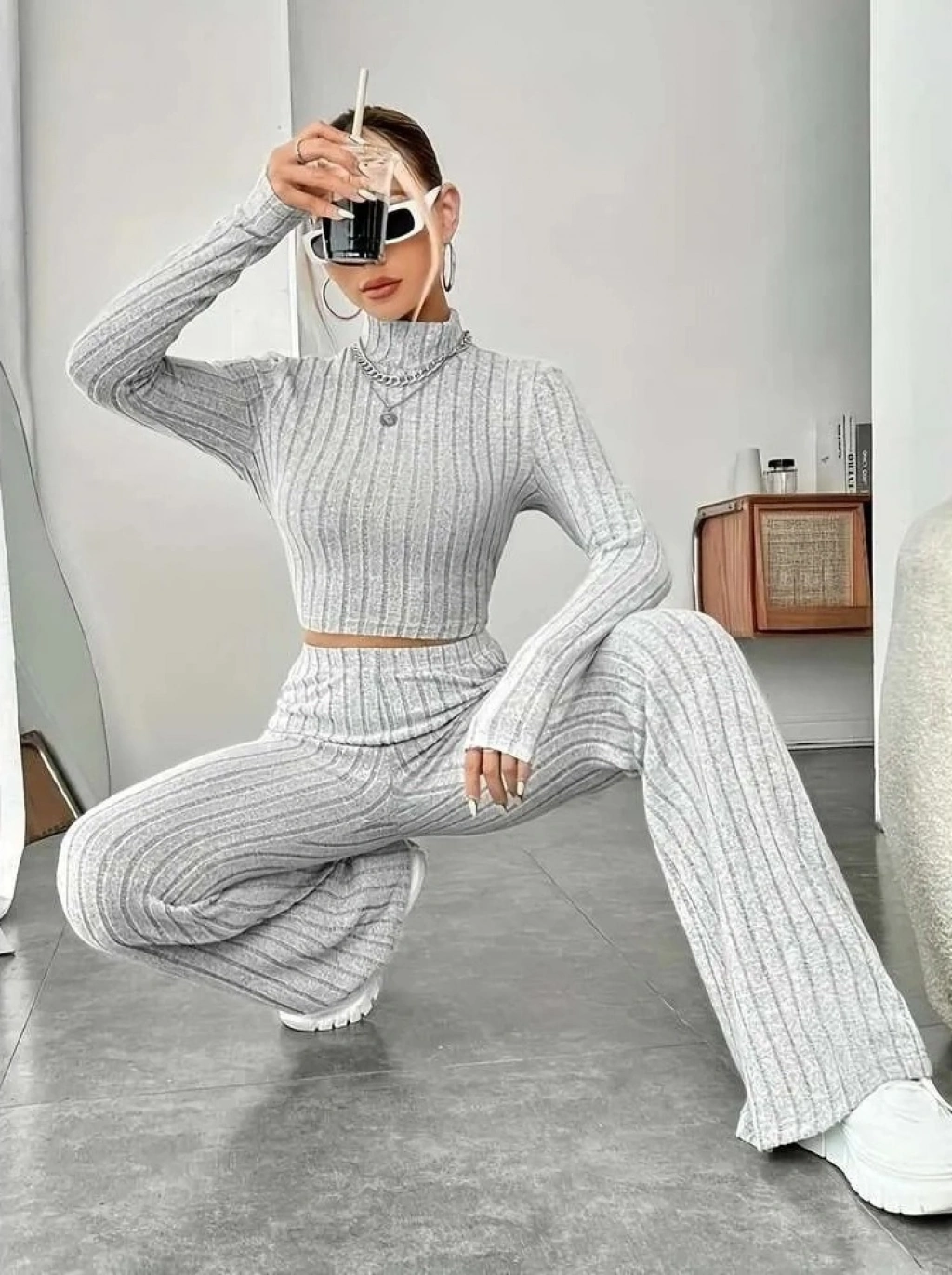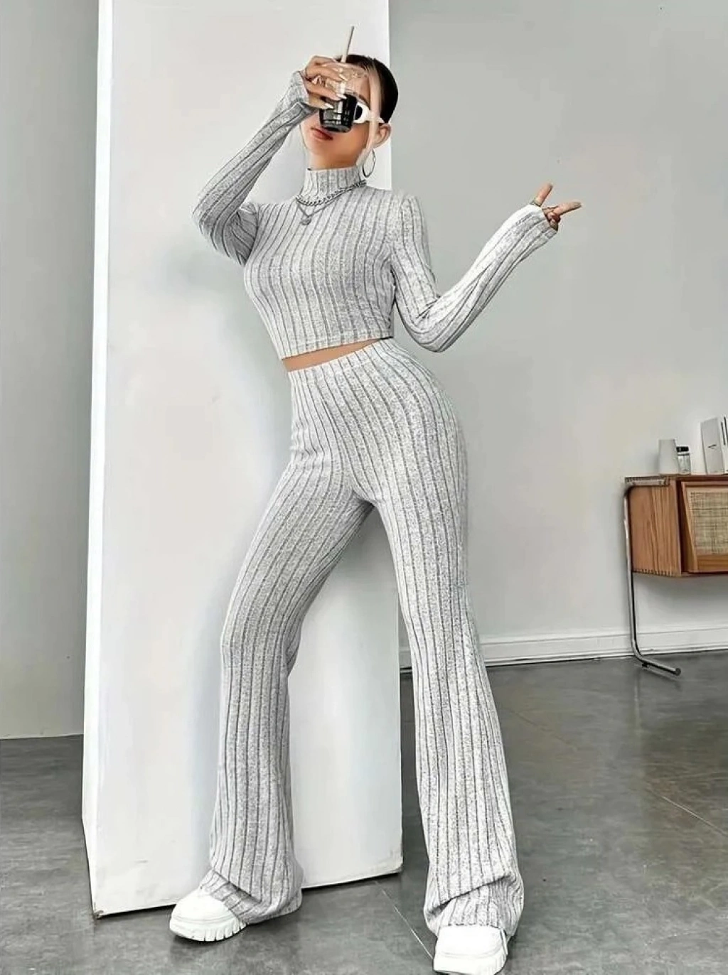 Kadın Uzun Kollu Balıkçı Yaka Krop Ve Pantolon şardonlu Kaşkorse Ikili Takım