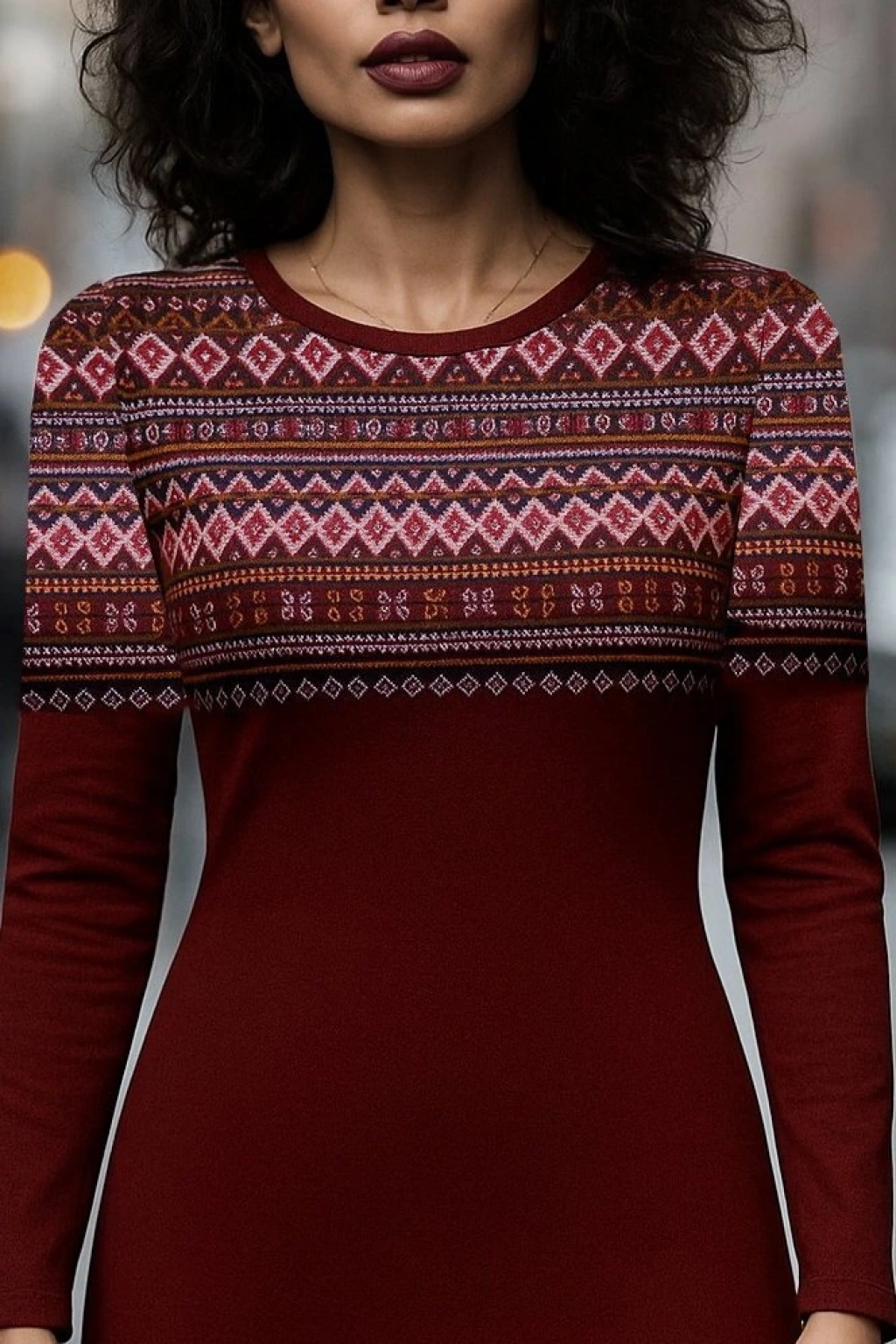 Kadın Uzun Kollu Bisiklet Yaka Etnik Desenli Kısa şardonlu Dalgıç Elbise