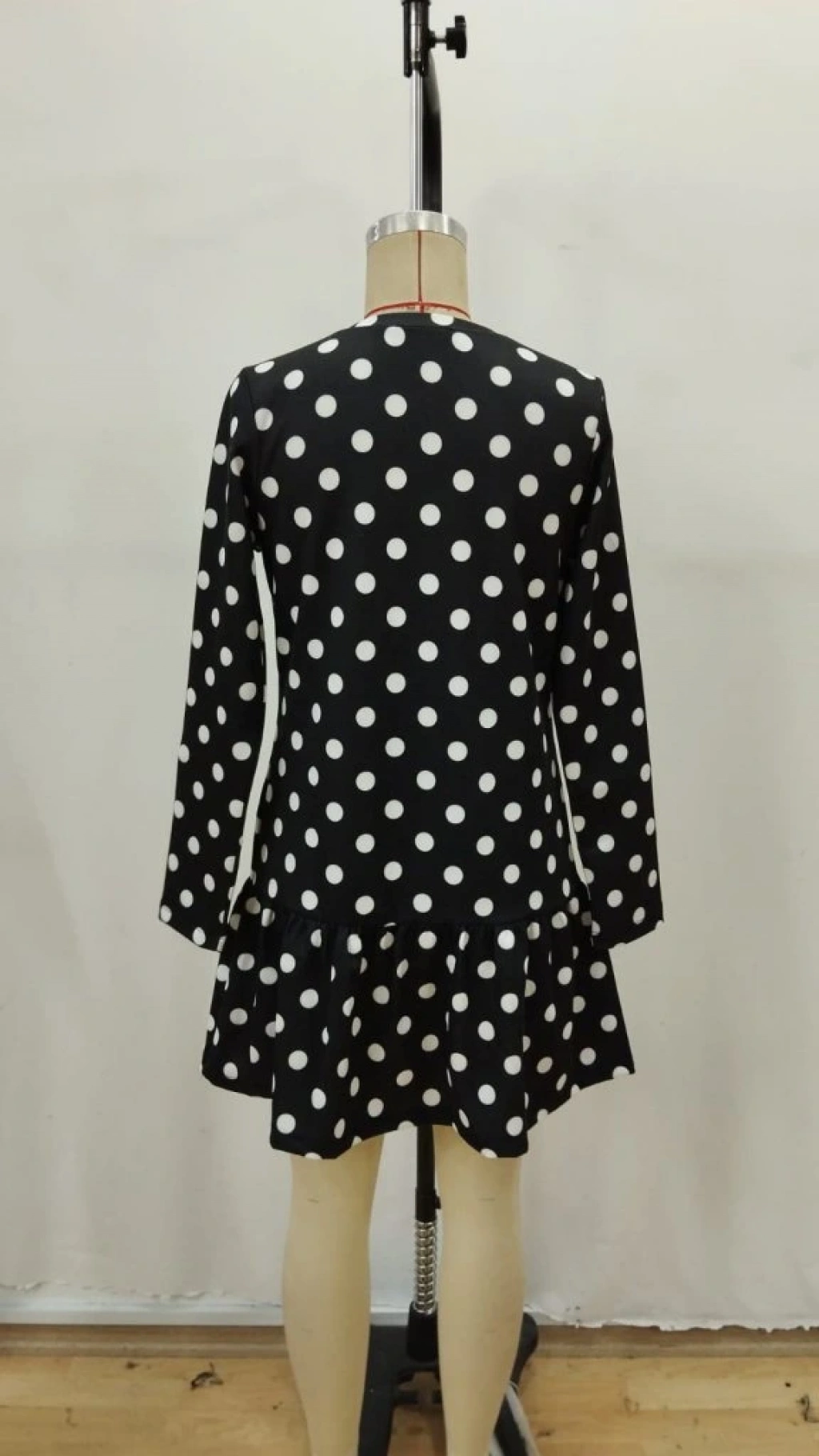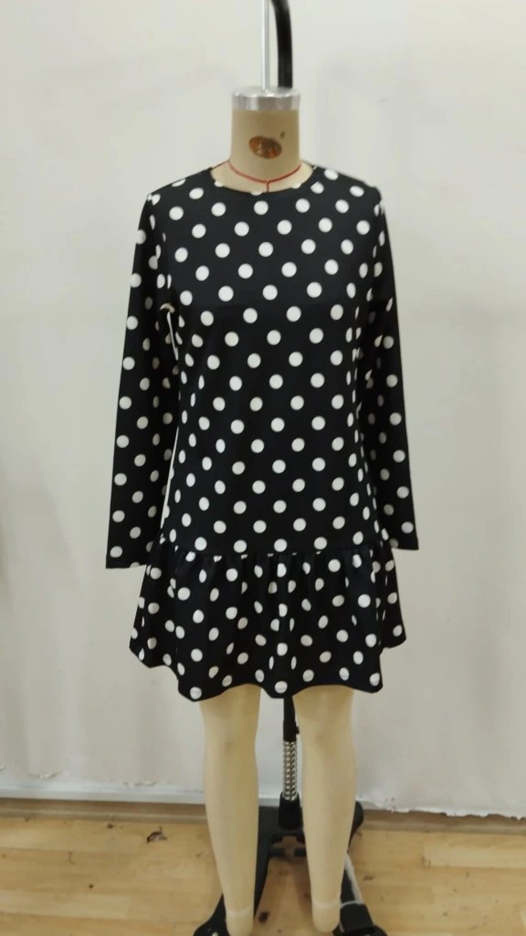 Kadın Uzun Kollu Bisiklet Yaka Fırfırlı Puantiyeli Kısa Modal Elbise