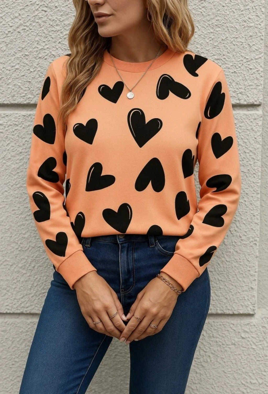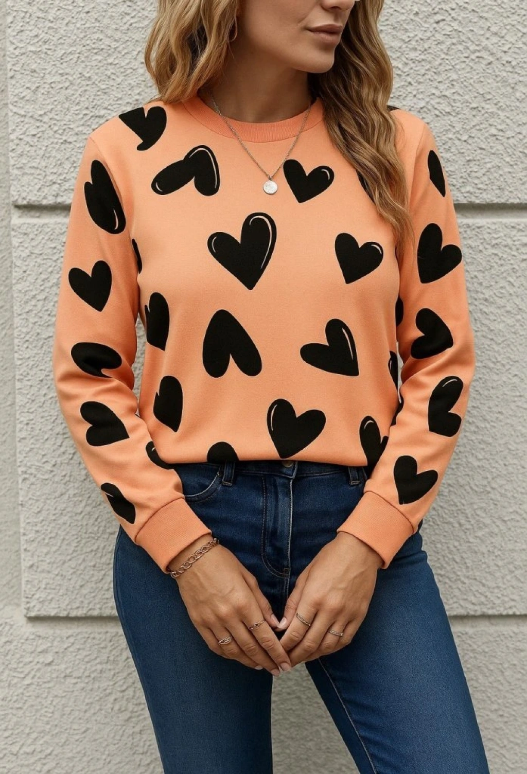 Kadın Uzun Kollu Bisiklet Yaka Kalp Desenli Iki Iplik Bluz