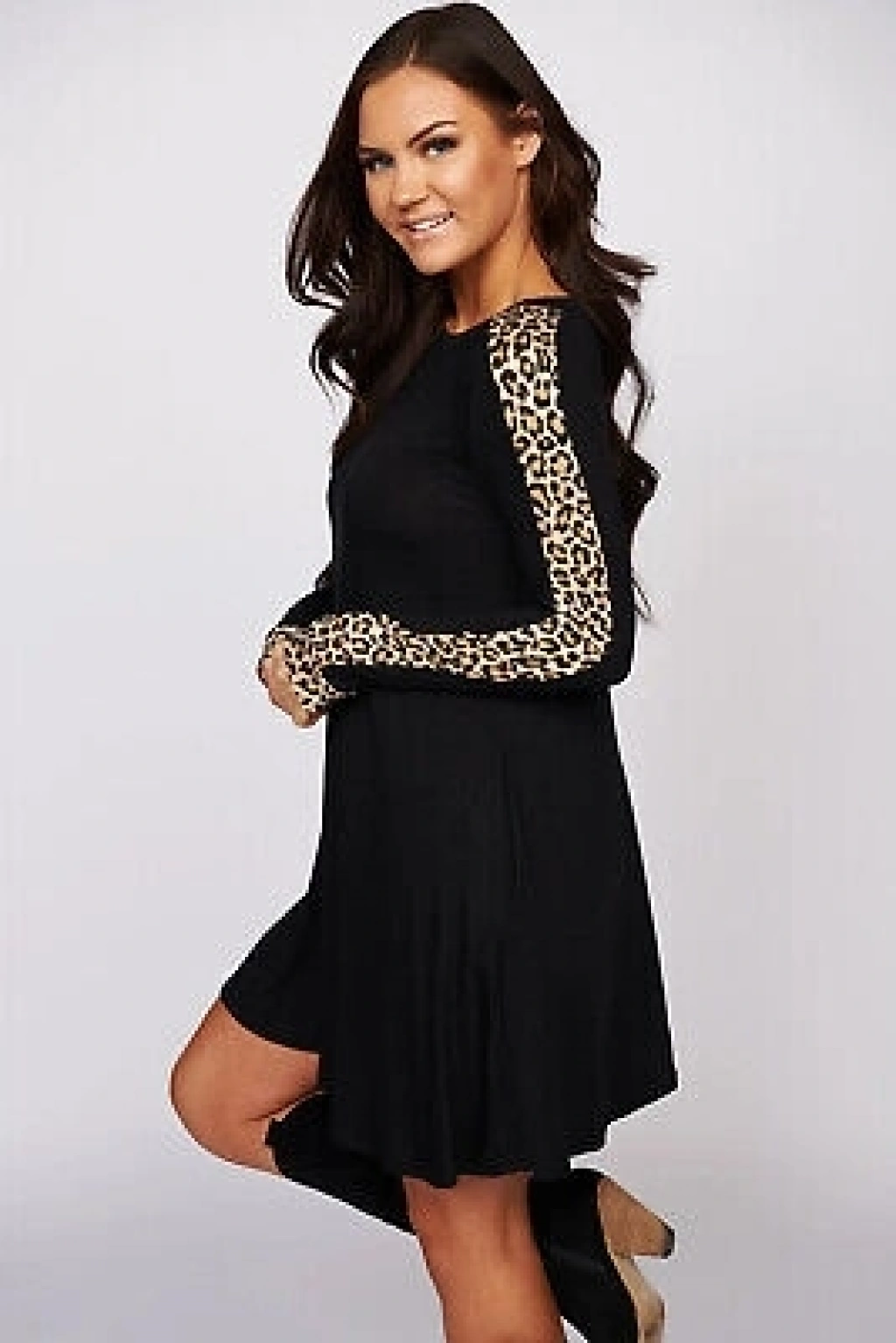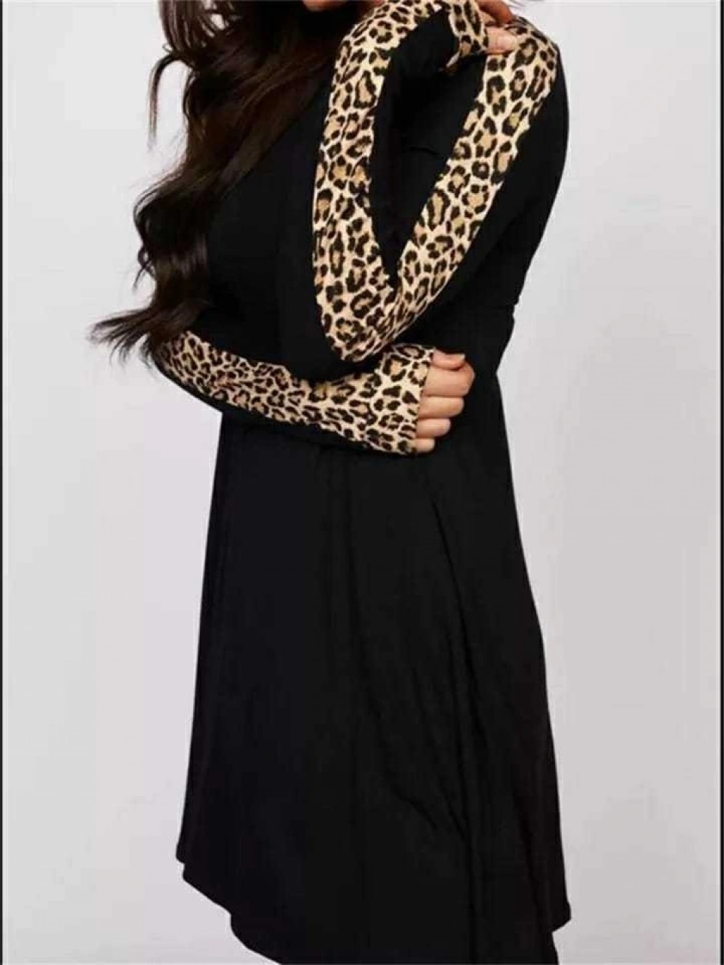 Kadın Uzun Kollu Bisiklet Yaka Kollar Leopar şeritli Salaş Iki Iplik Elbise