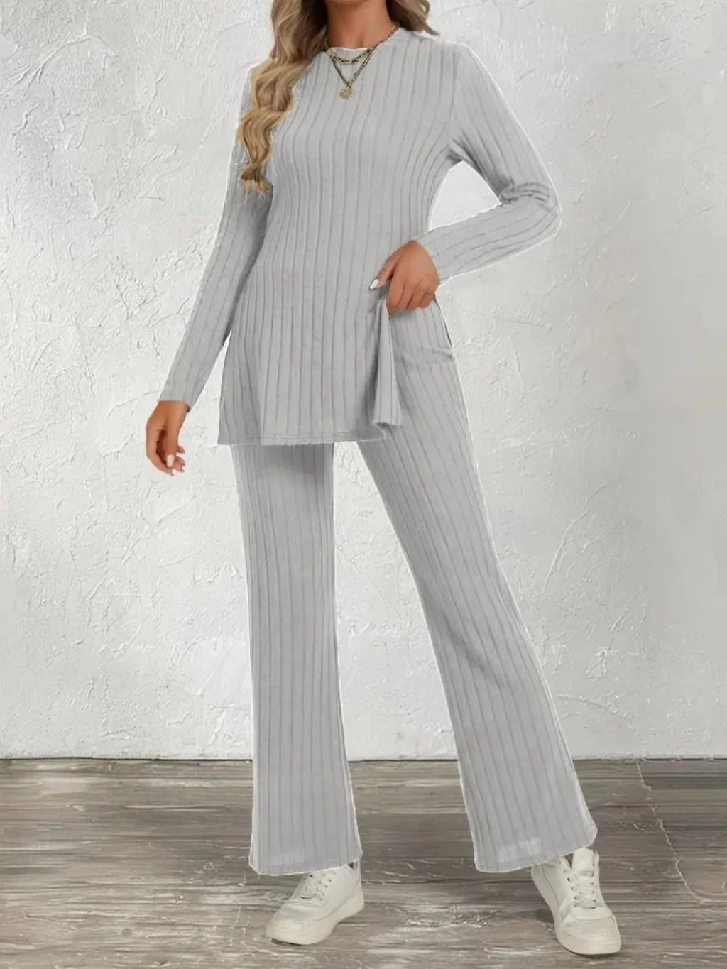 Kadın Uzun Kollu Bisiklet Yaka Yandan Yırtmaçlı şardonlu Kaşkorse Bluz Ve Pantolon Ikili Takım
