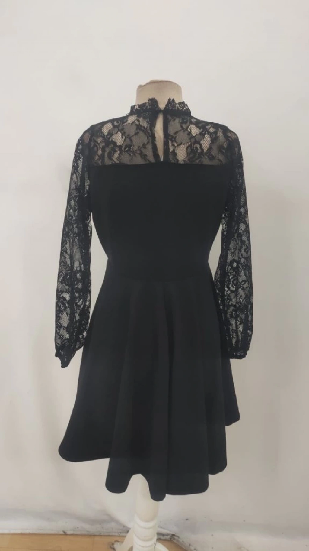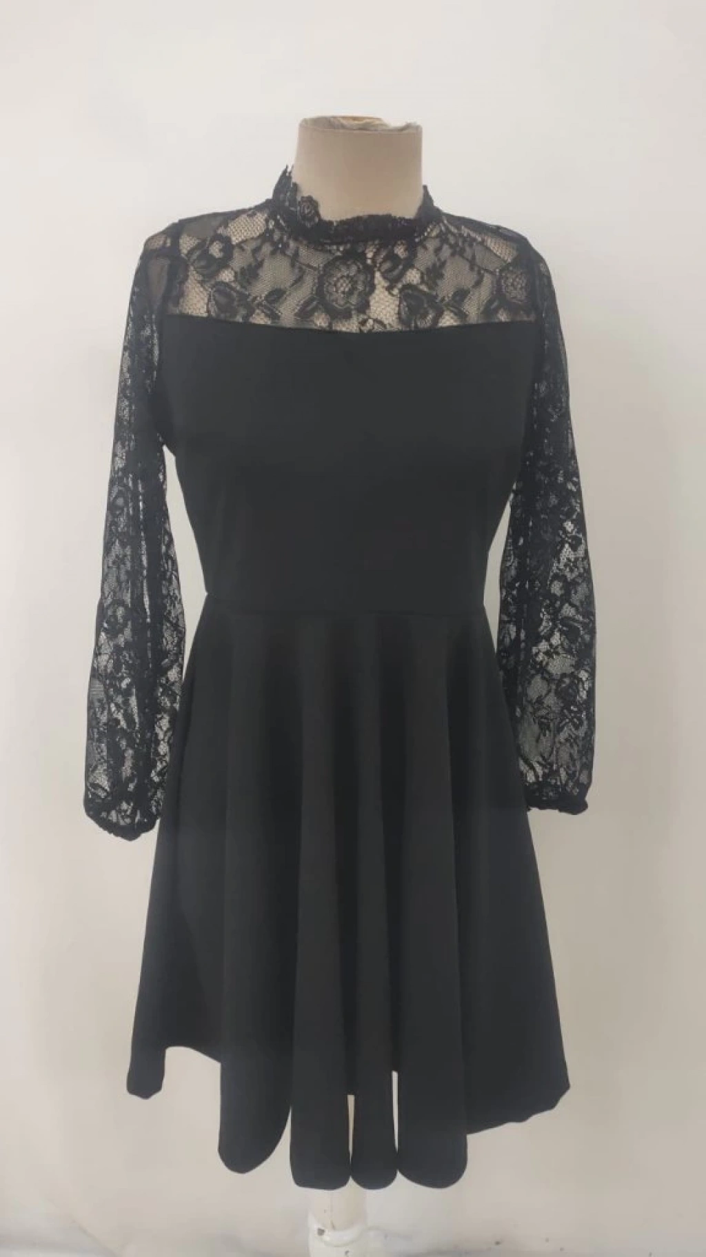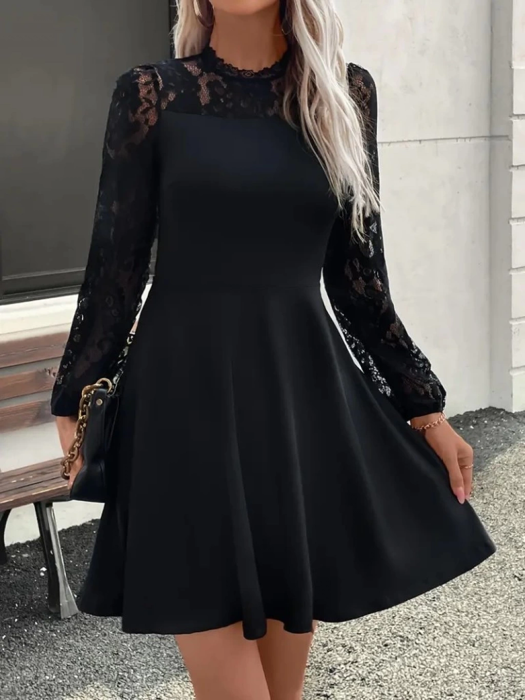 Kadın Uzun Kollu Dantelli Kloş Mini Ithal Krep Elbise