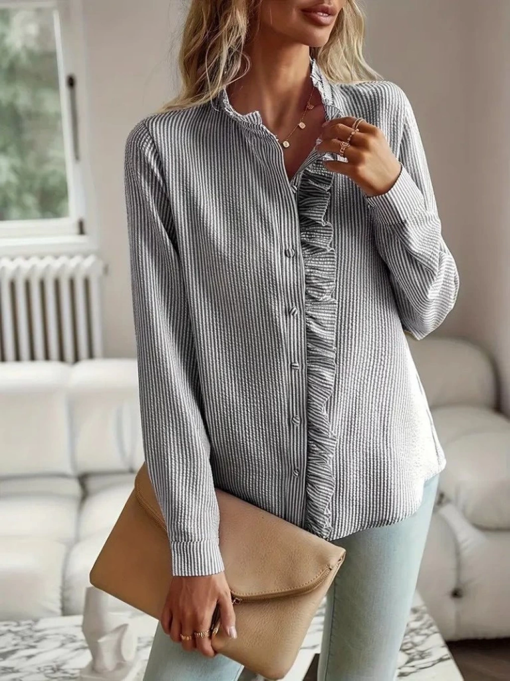 Kadın Uzun Kollu Fırfır Yakalı önden Düğmeli çizgili Burgu Gömlek