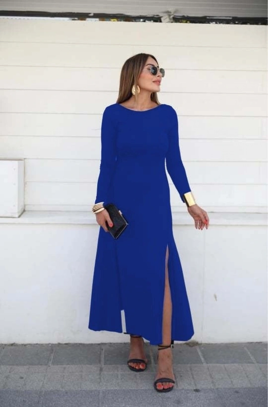 Kadın Uzun Kollu Hafif Kayık Yaka Sırt Dekolteli Yırtmaç Detaylı Viskon Tam Boy Elbise