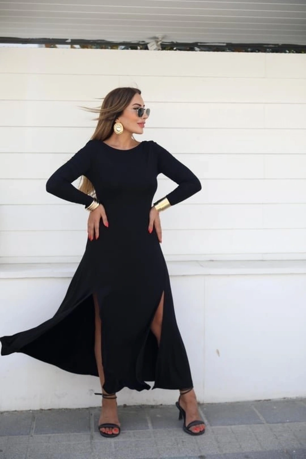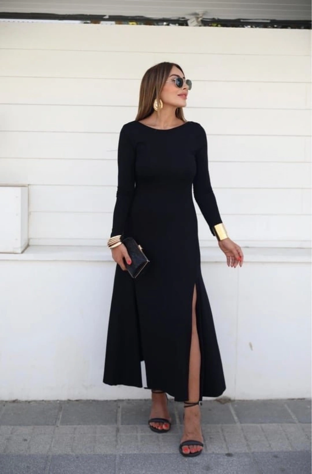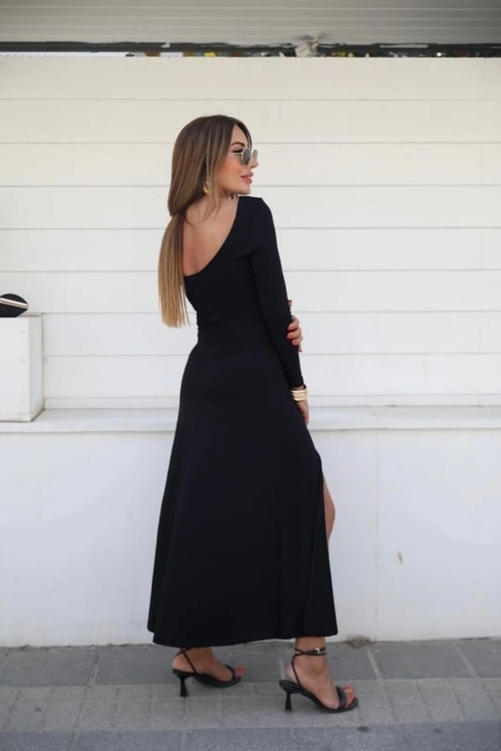 Kadın Uzun Kollu Hafif Kayık Yaka Sırt Dekolteli Yırtmaç Detaylı Viskon Tam Boy Elbise