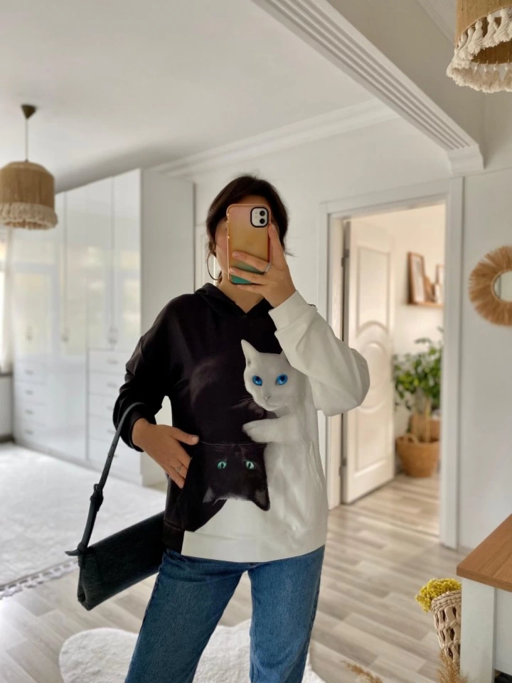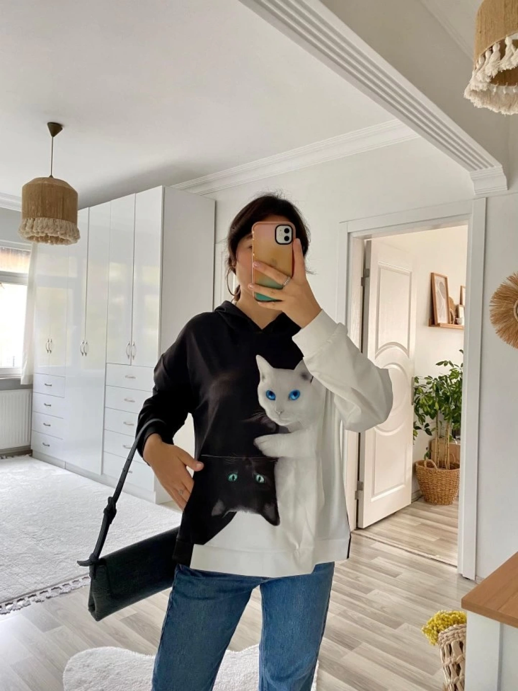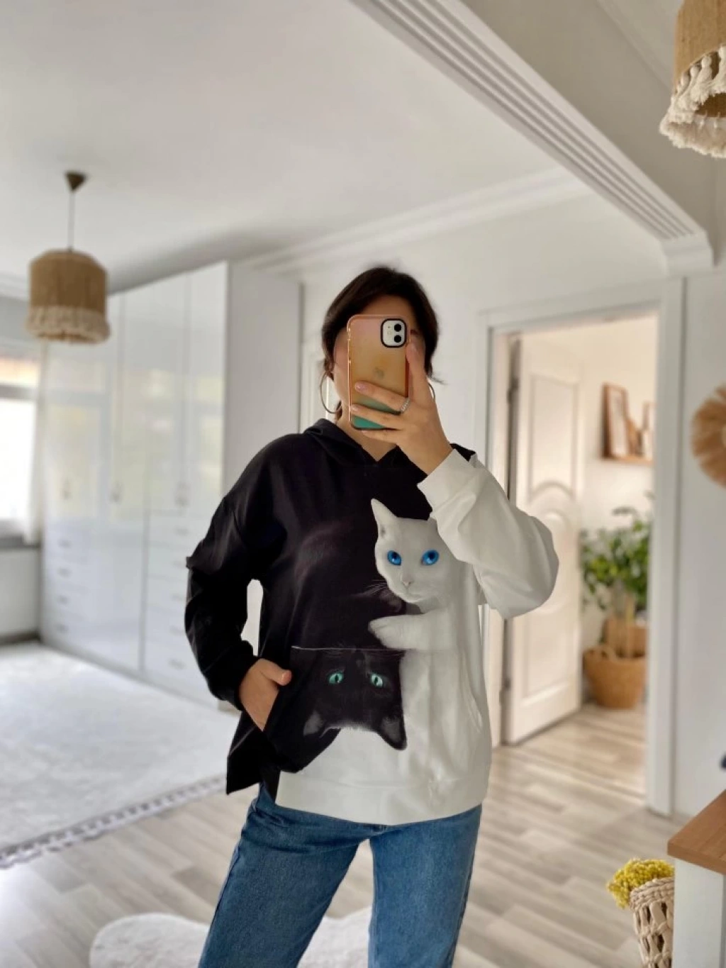 Kadın Uzun Kollu Kapşonlu Bağcıklı Kedi Desenli şardonlu Dalgıç Bluz