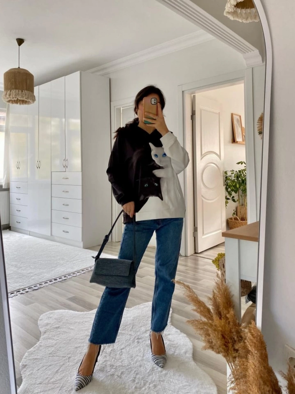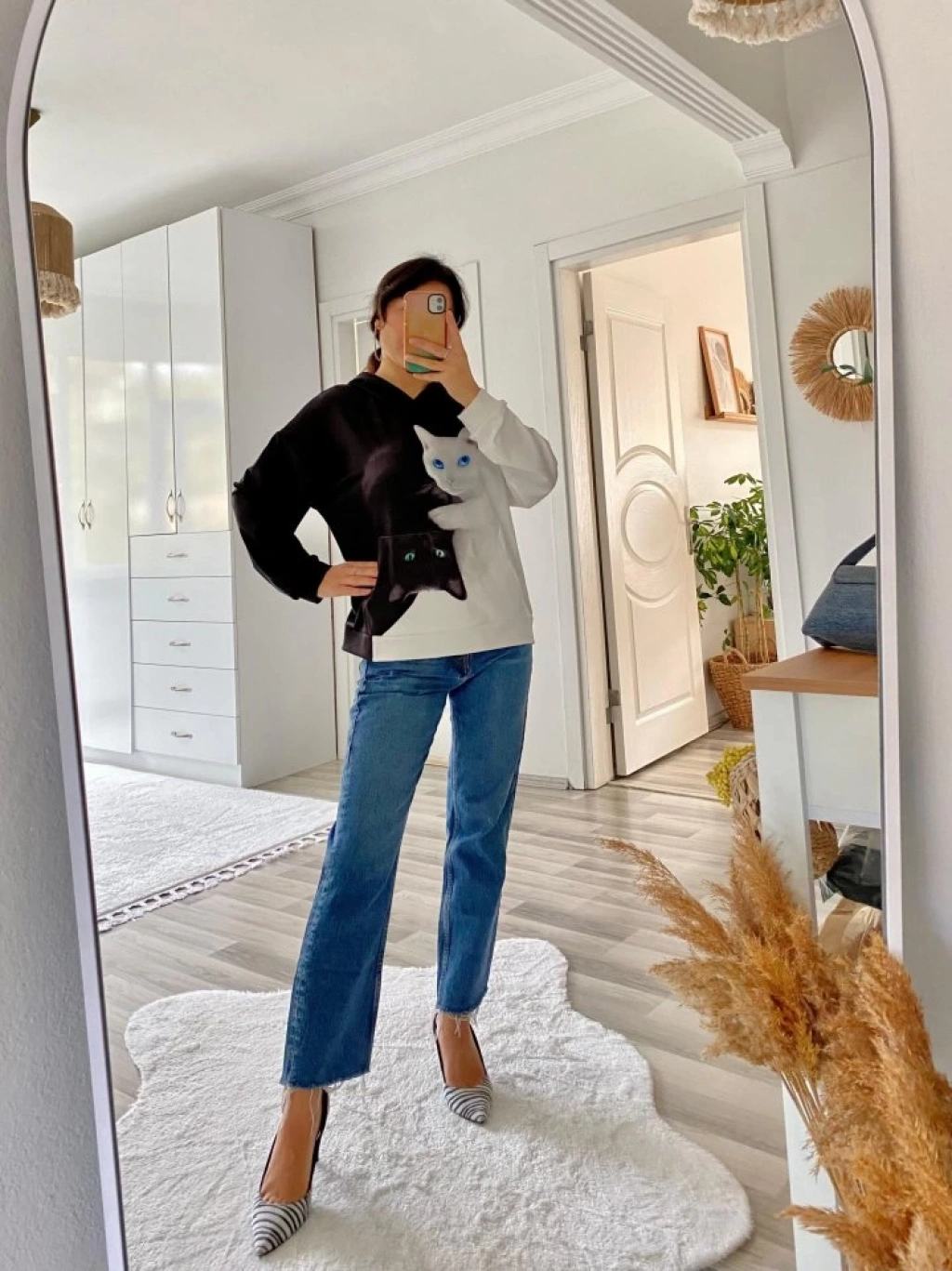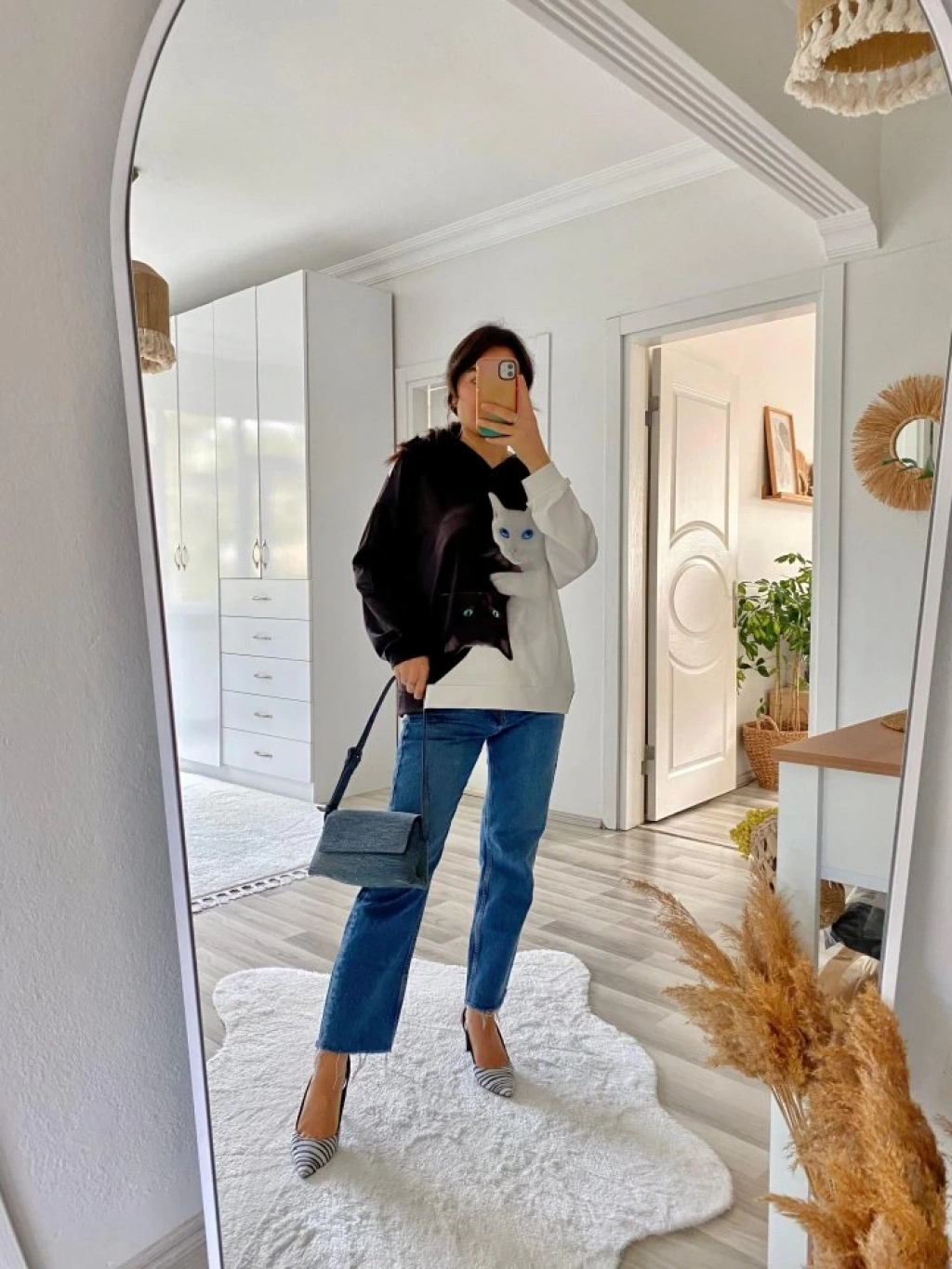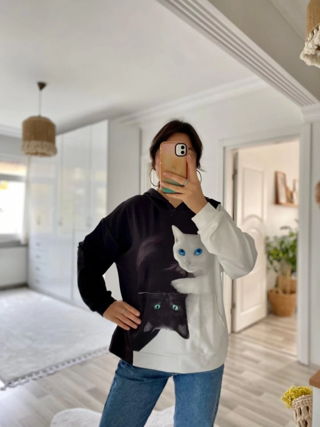 Kadın Uzun Kollu Kapşonlu Bağcıklı Kedi Desenli şardonlu Dalgıç Bluz