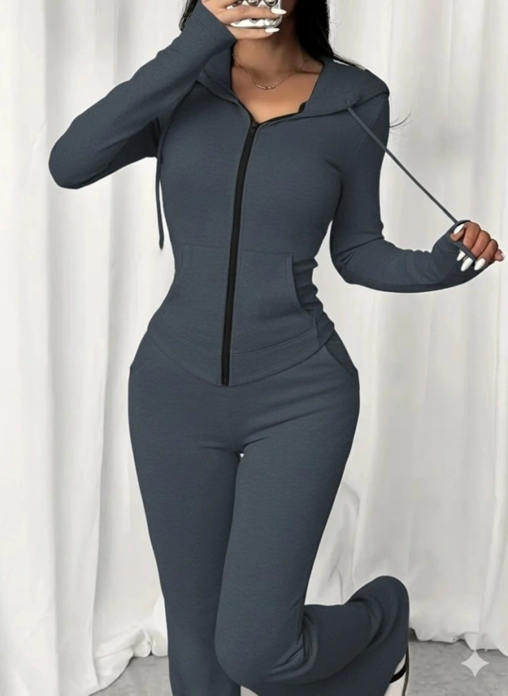 Kadın Uzun Kollu Kapşonlu Bağcıklı önü Fermuarlı Viskon Iki Iplik Bluz Ve Pantolon Ikili Takım