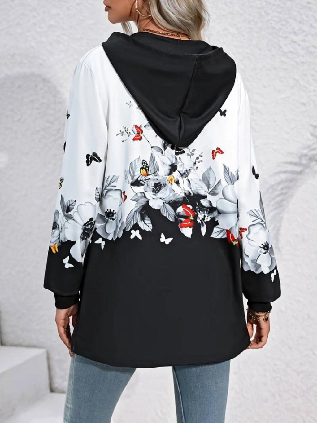 Kadın Uzun Kollu Kapşonlu Fermuarlı çiçek-kelebek Desenli şardonlu Dalgıç Ceket