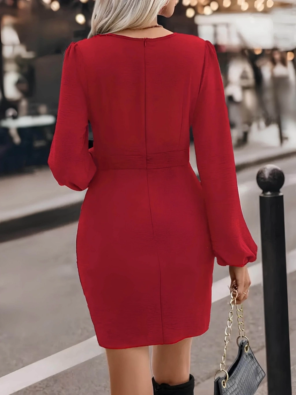 Kadın Uzun Kollu Kruvaze Yaka önden Asimetrik Detay Kısa Krep Elbise