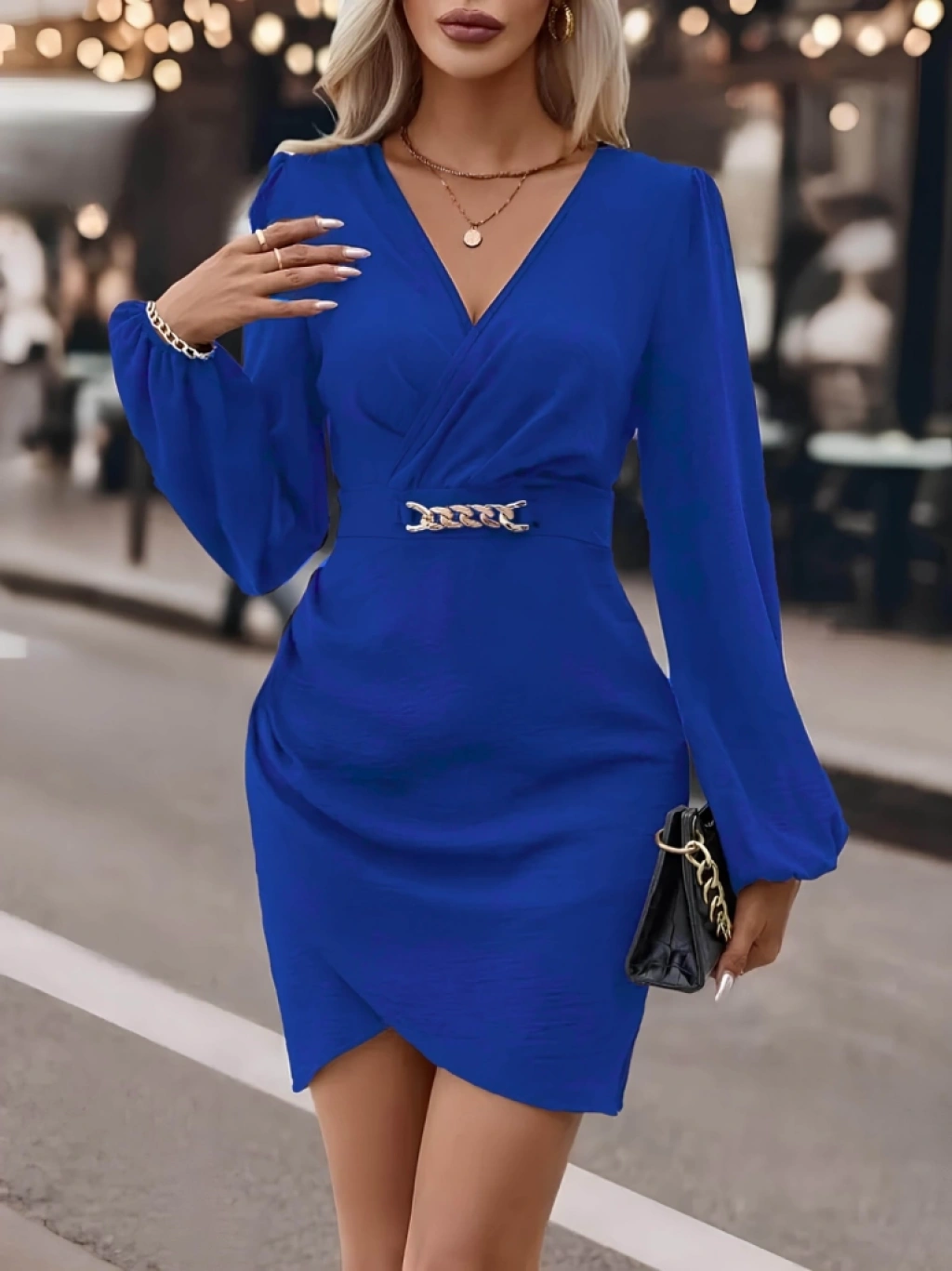 Kadın Uzun Kollu Kruvaze Yaka Yandan Büzgülü Asimetrik Detaylı Ithal Krep Mini Elbise
