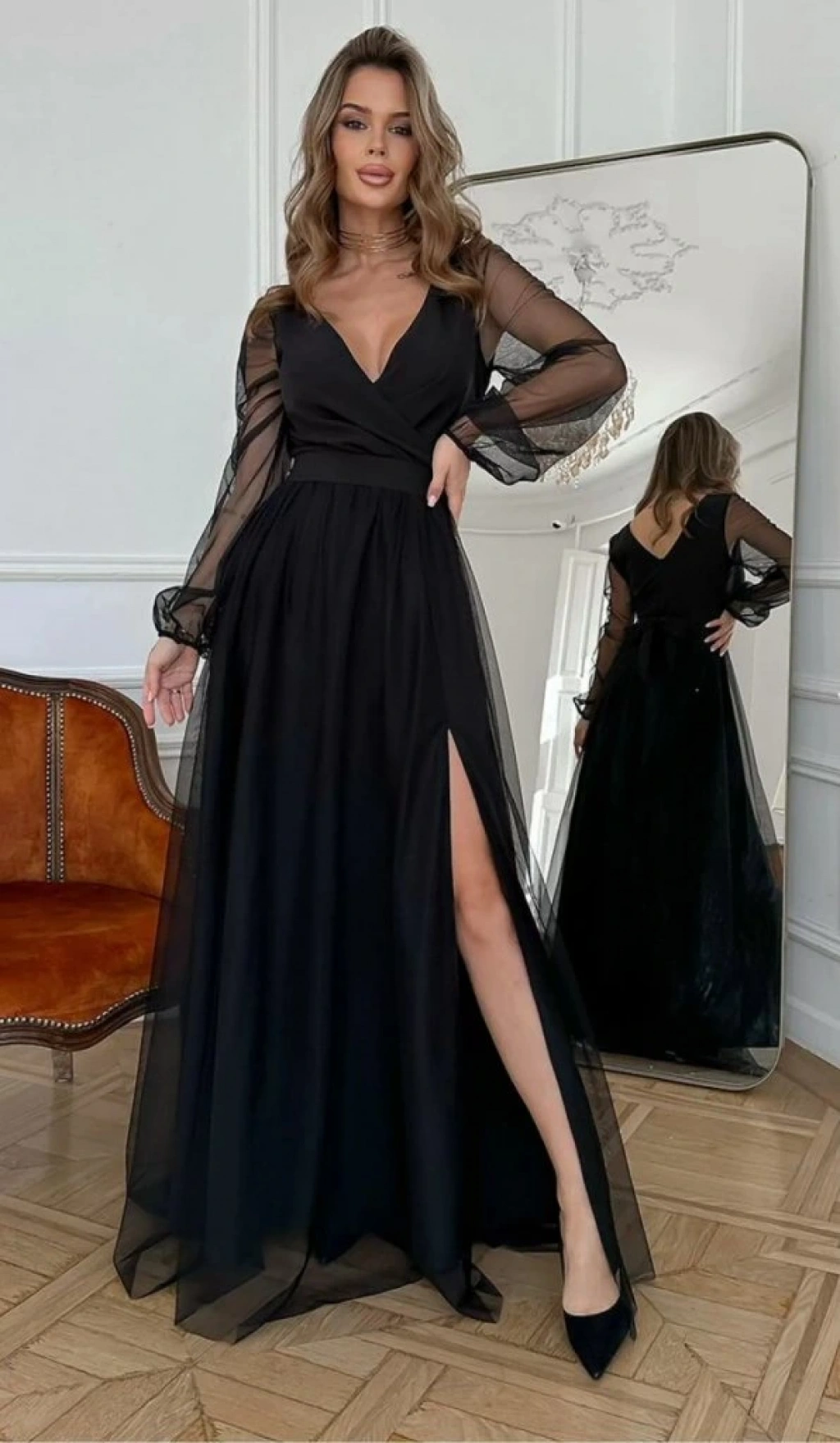 Kadın Uzun Kollu Kruvaze Yakalı Belden Kuşaklı Tüllü Uzun Ithal Krep Elbise