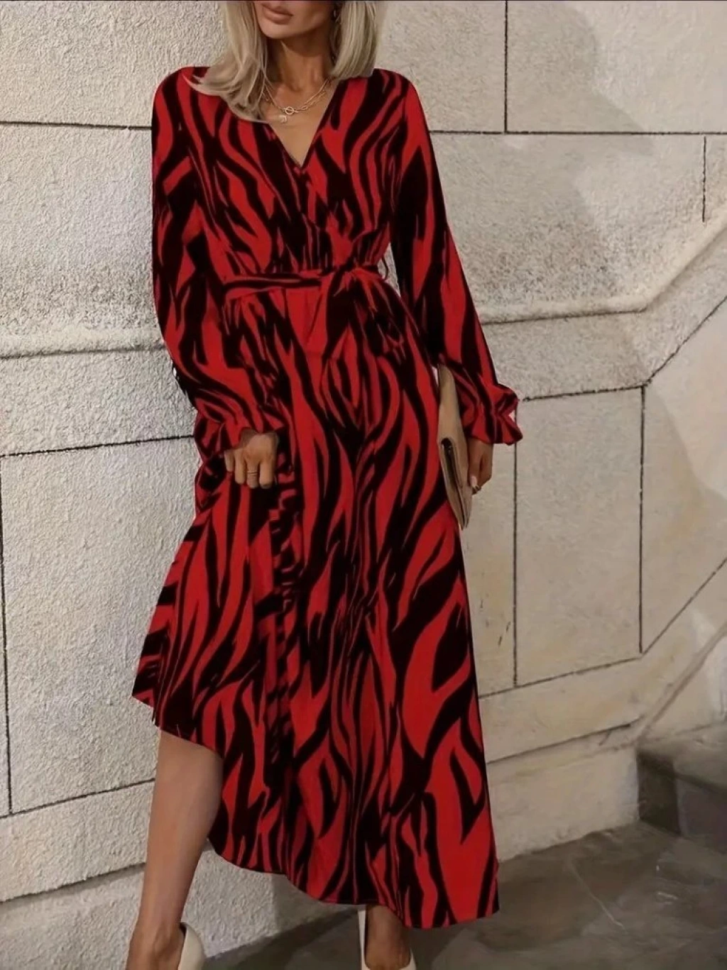 Kadın Uzun Kollu Kruvaze Yakalı Kuşaklı Zebra Desenli Süprem Maxi Elbise
