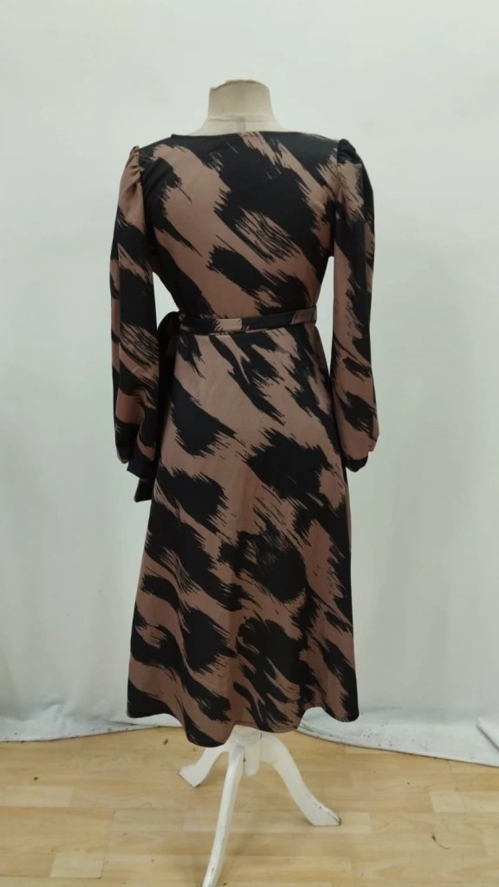 Kadın Uzun Kollu Kruvaze Yakalı Yandan Bağlamalı Desenli Mini Modal Elbise