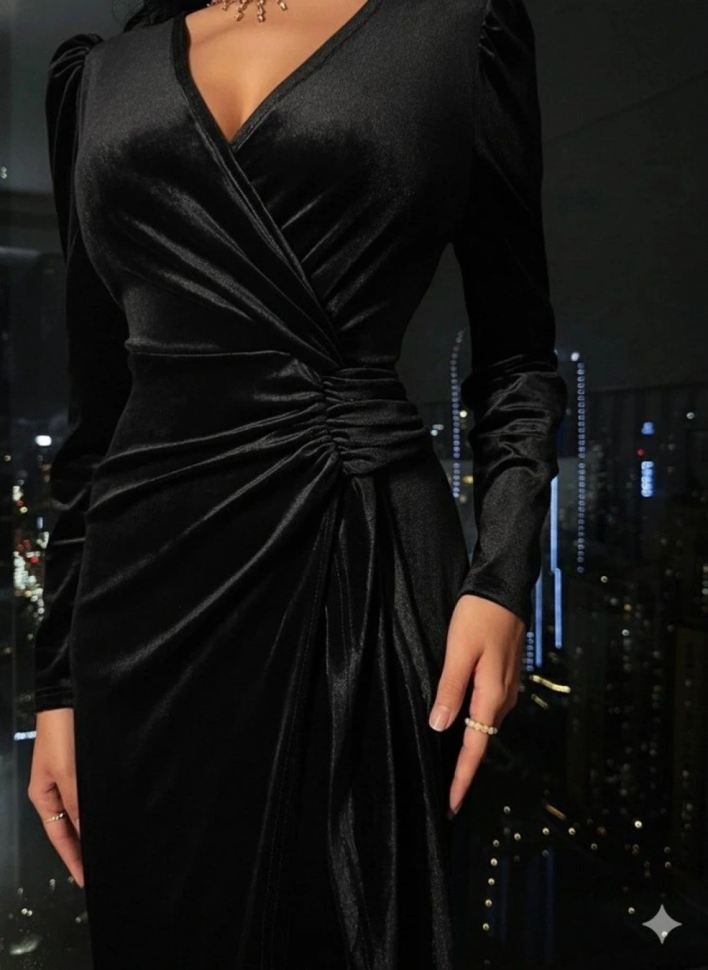 Kadın Uzun Kollu Kruvaze Yakalı Yandan Büzgülü Midi Kadife Elbise
