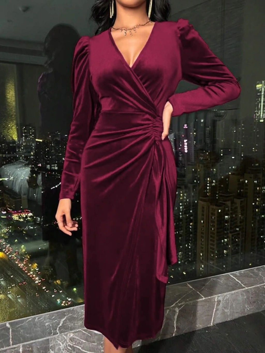 Kadın Uzun Kollu Kruvaze Yakalı Yandan Büzgülü Midi Kadife Elbise