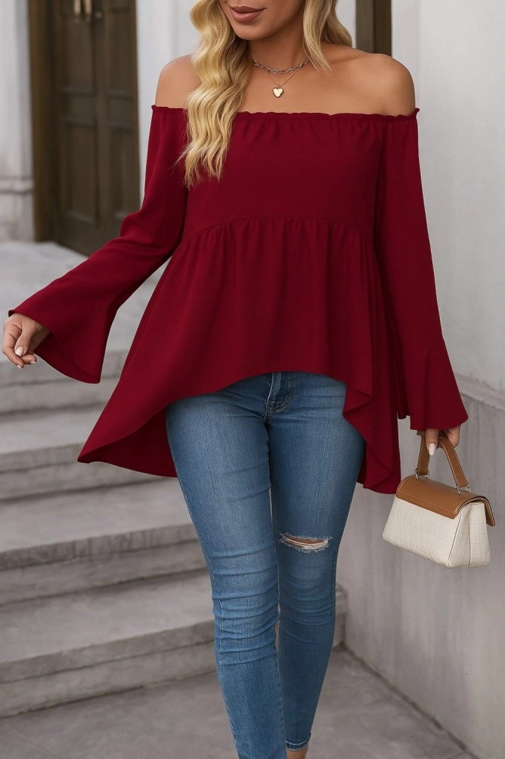 Kadın Uzun Kollu Madonna Yaka Asimetrik Detaylı Kolları Ispanyol Viskon Bluz