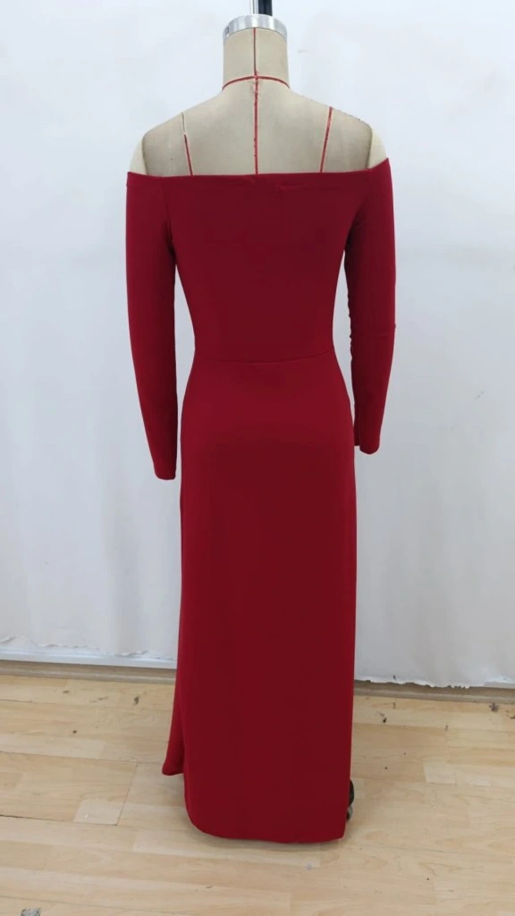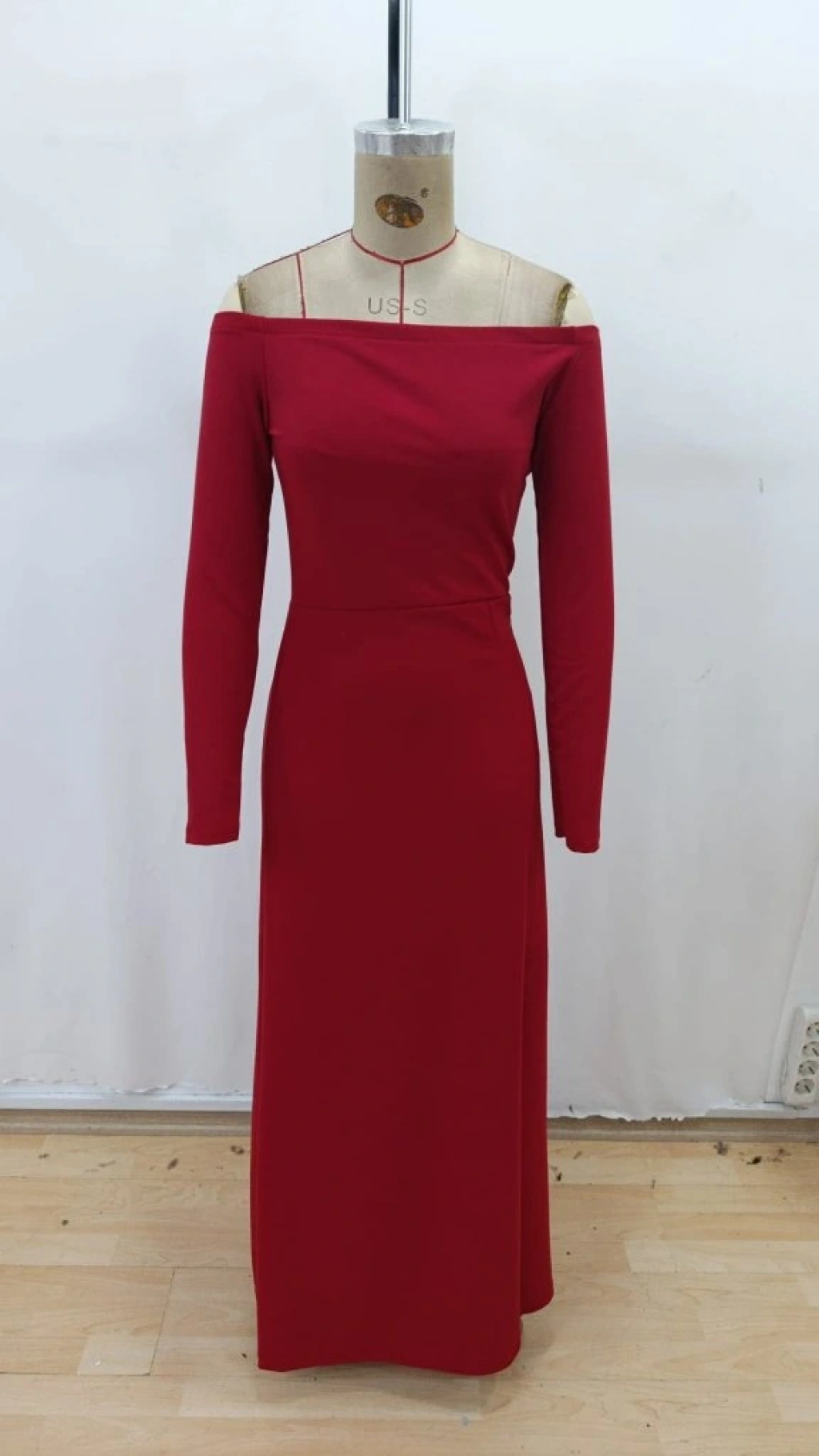 Kadın Uzun Kollu Madonna Yakalı Yırtmaç Detaylı Uzun Ithal Krep Elbise