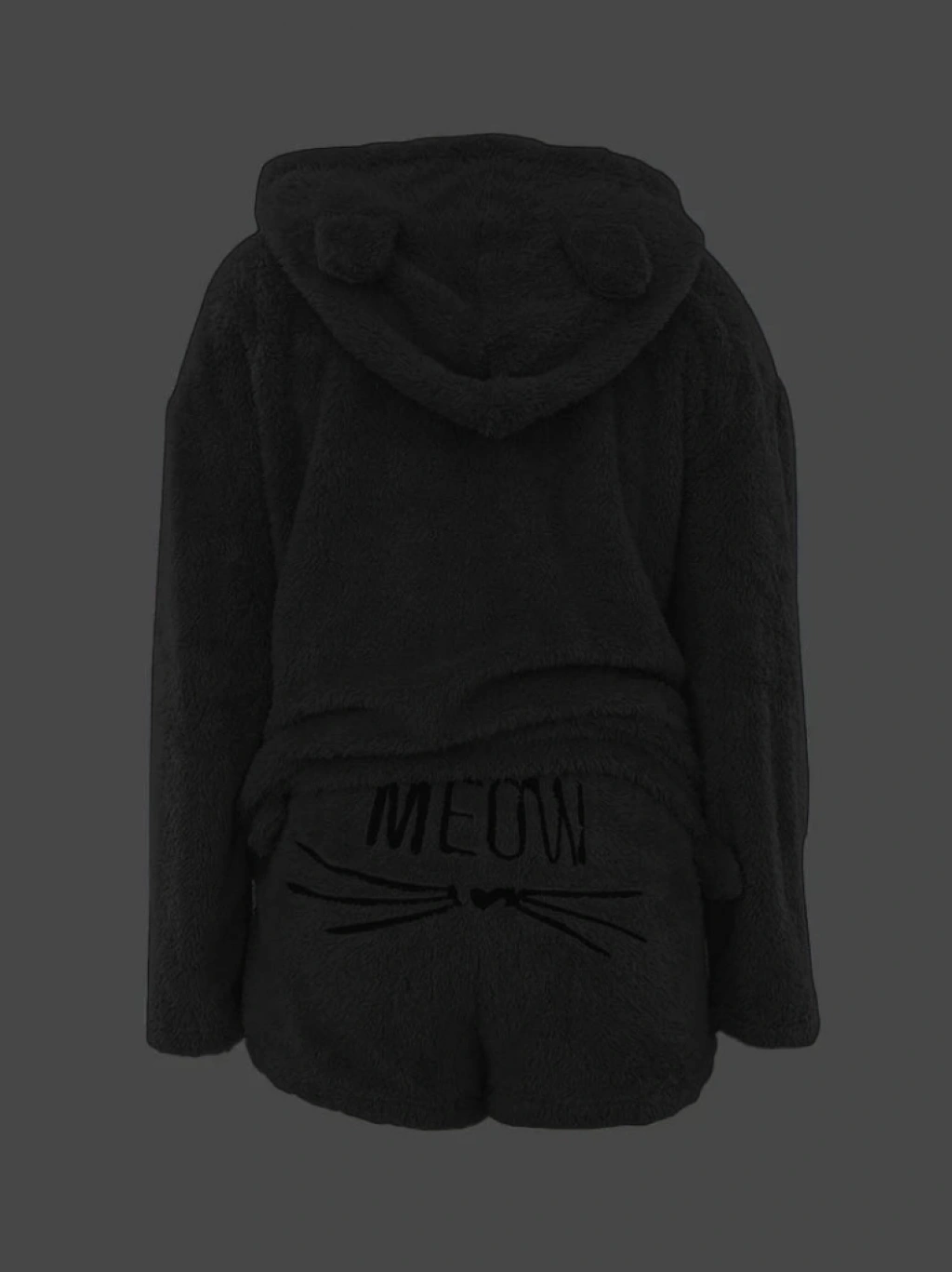 Kadın Uzun Kollu Meow Kedi Nakışlı Kapşonlu Peluş Sweat Ve Short Ikili Takım