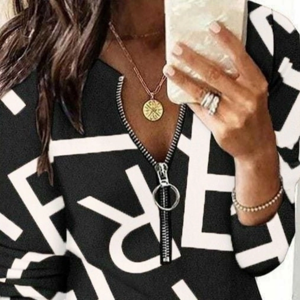 Kadın Uzun Kollu önden Fermuarlı Harf Baskılı şardonlu Dalgıç Bluz