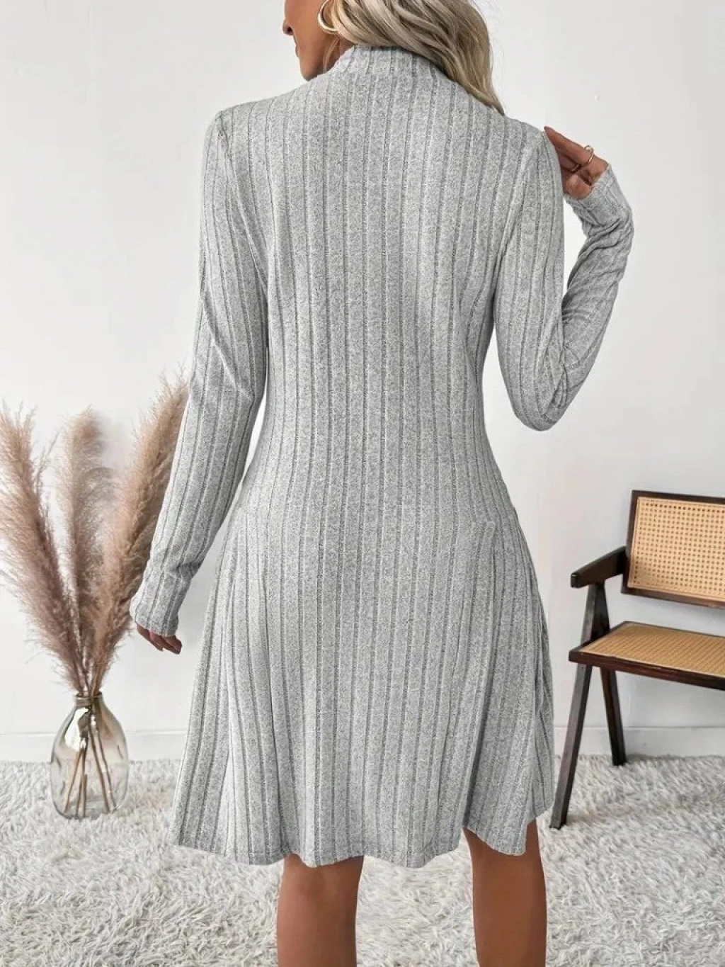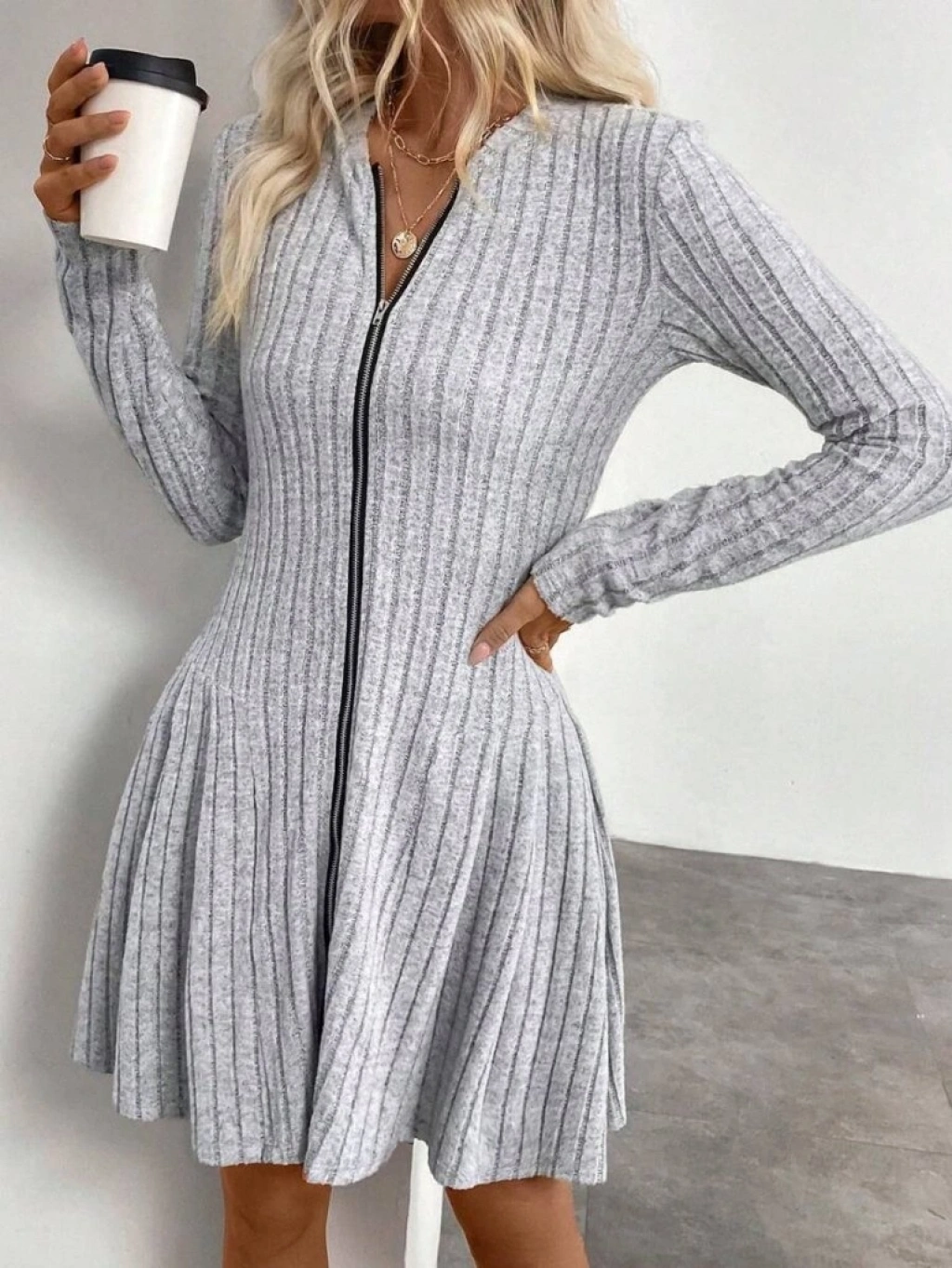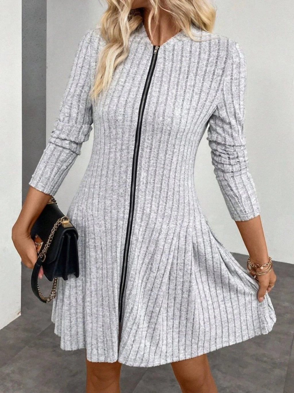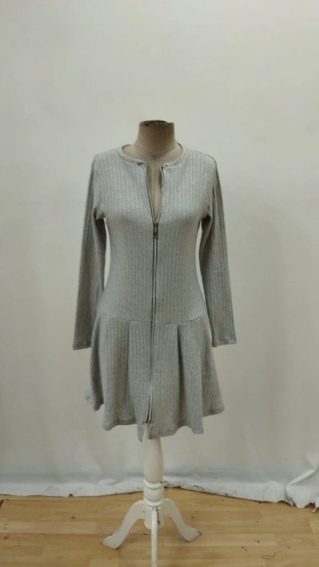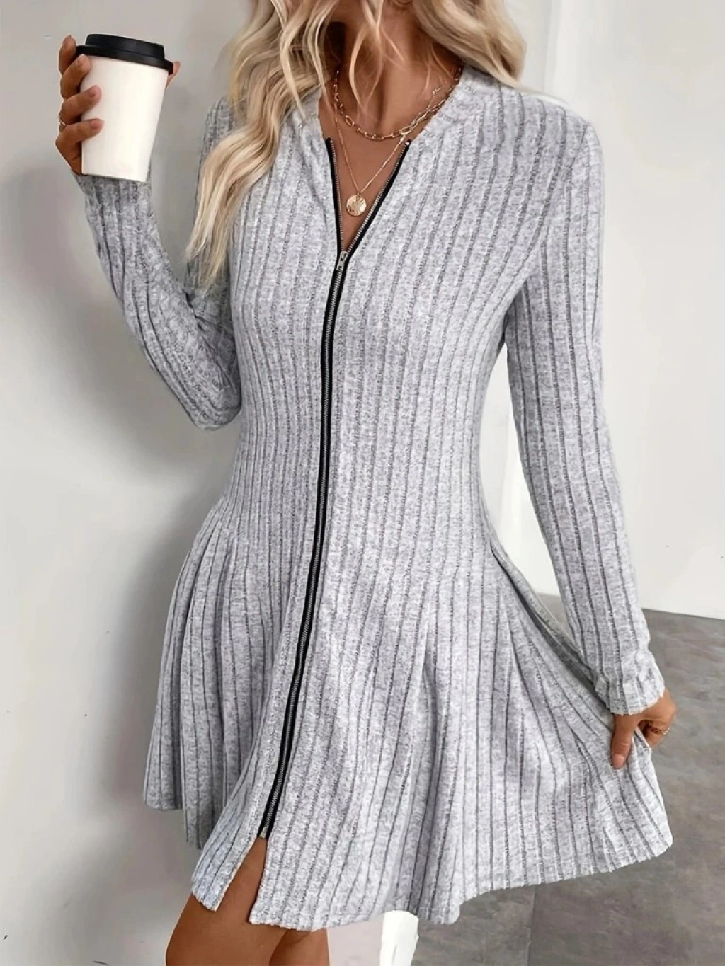Kadın Uzun Kollu önden Fermuarlı Pileli şardonlu Kaşkorse Mini Elbise