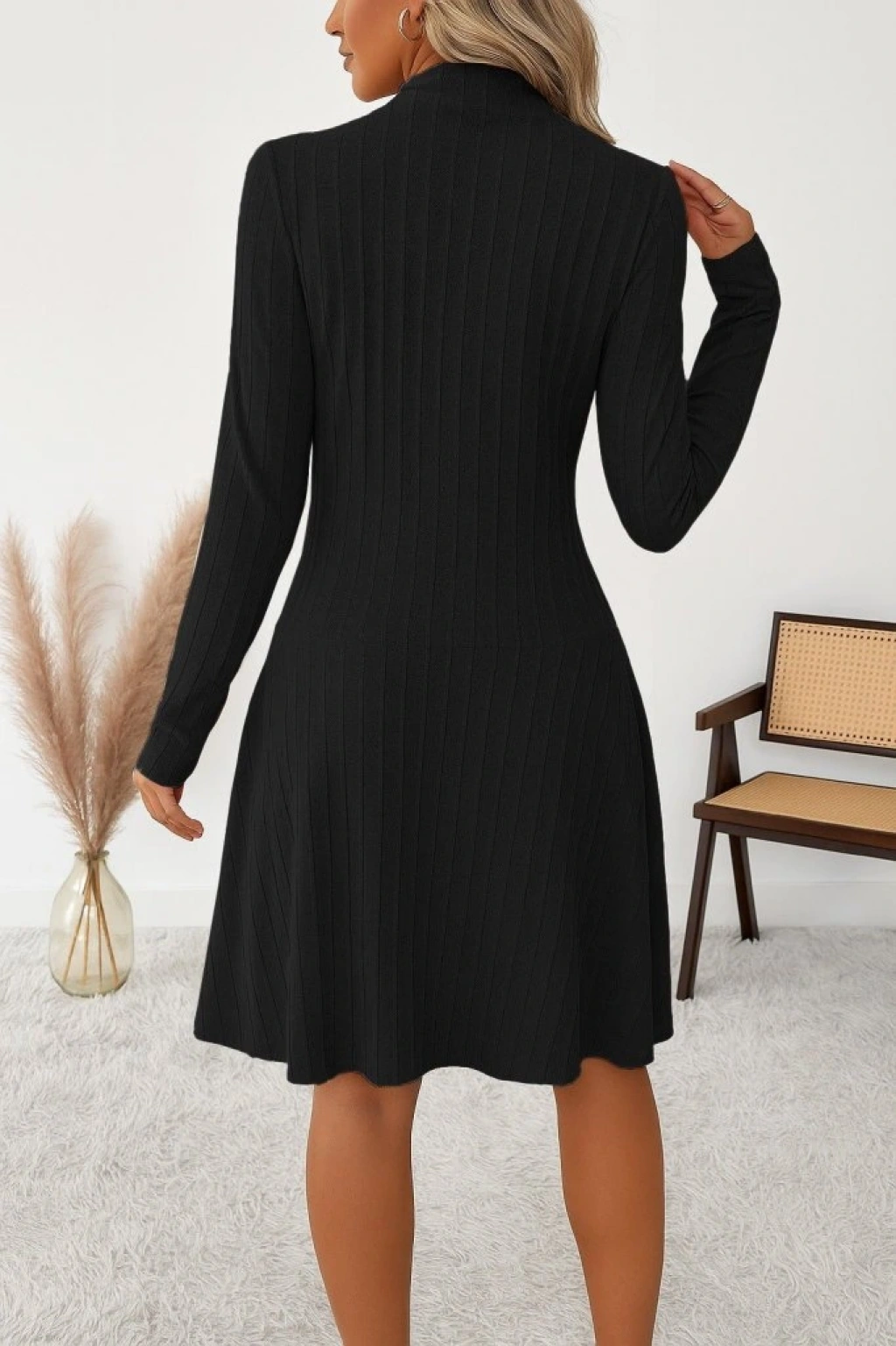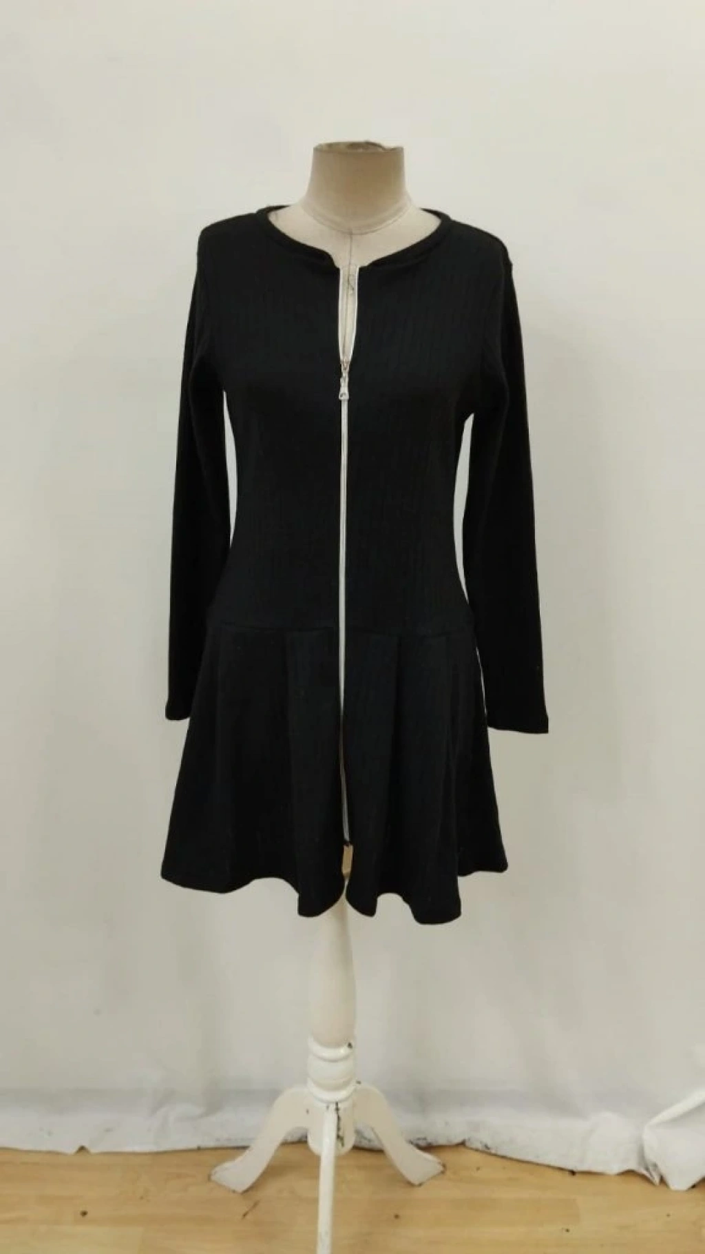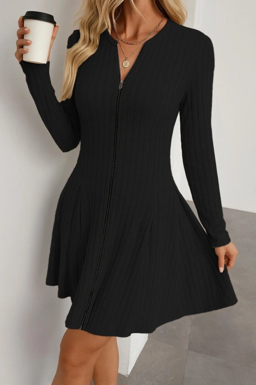 Kadın Uzun Kollu önden Fermuarlı Pileli şardonlu Kaşkorse Mini Elbise