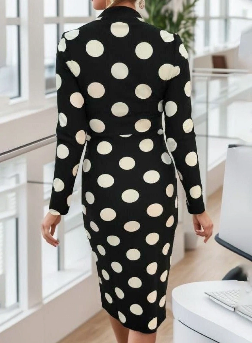 Kadın Uzun Kollu V Yaka Puantiyeli Krep Midi Boy Elbise
