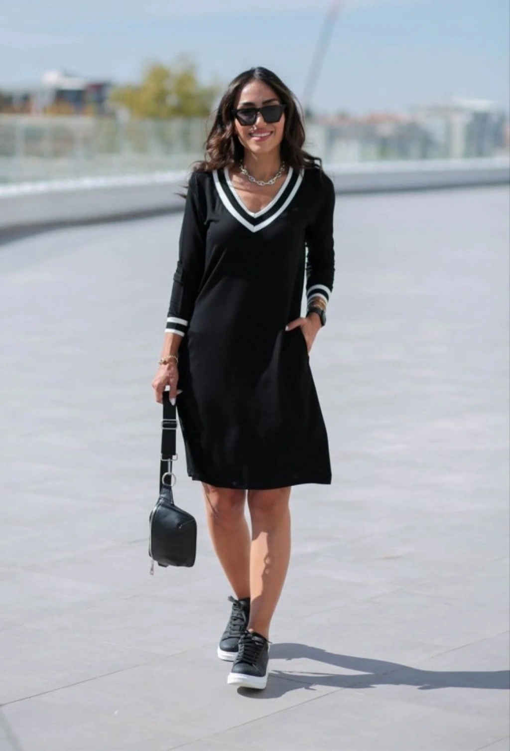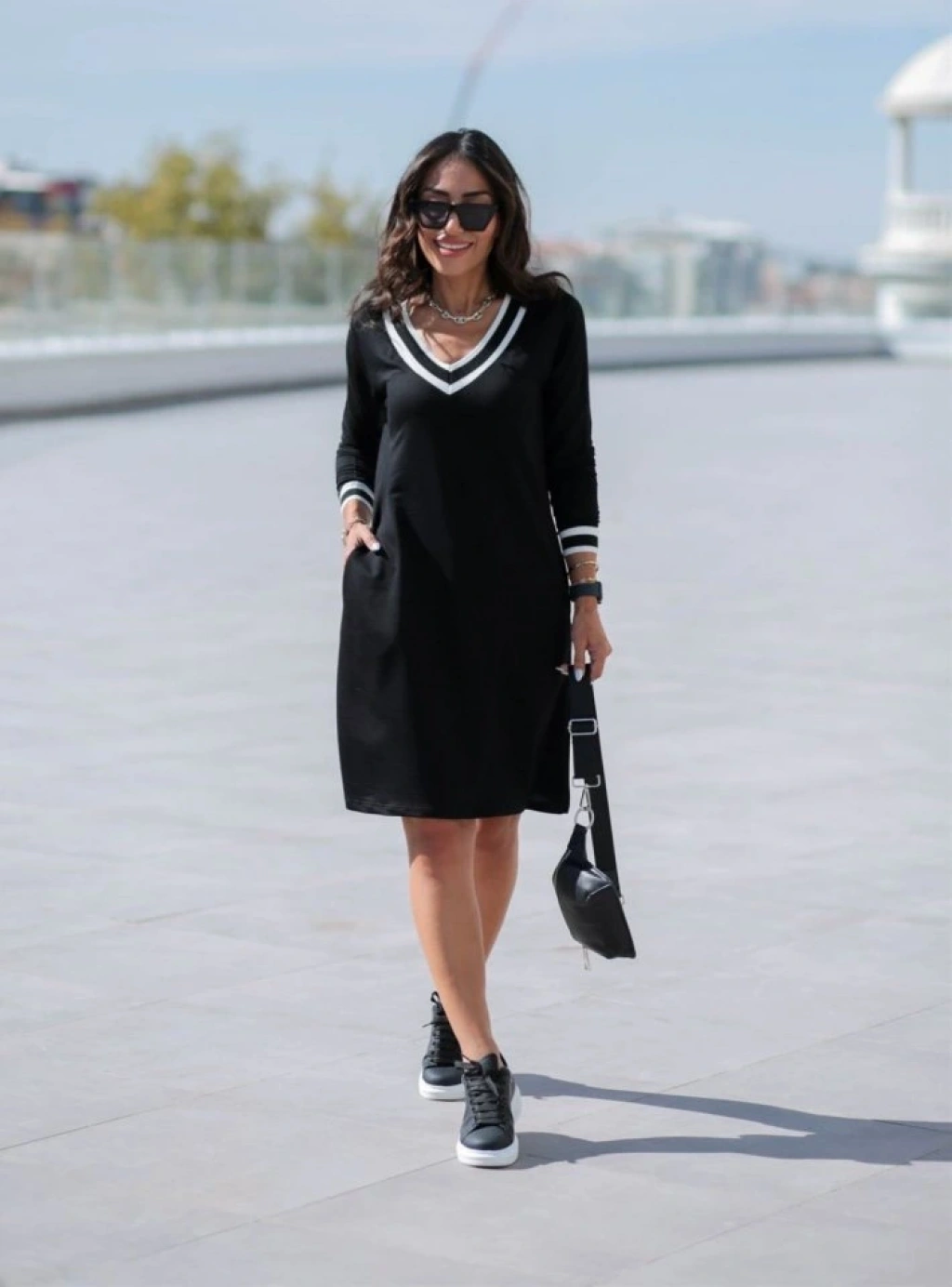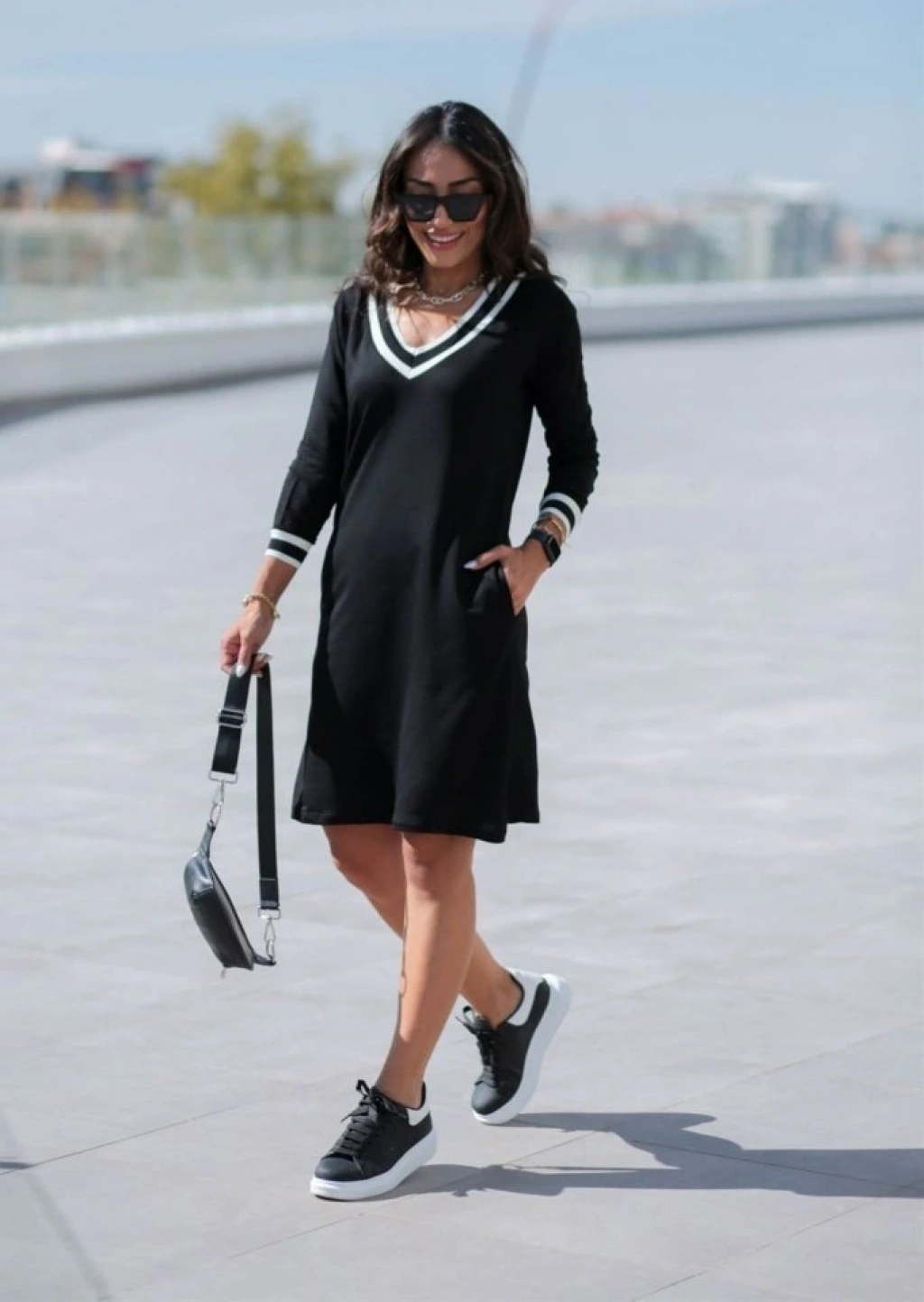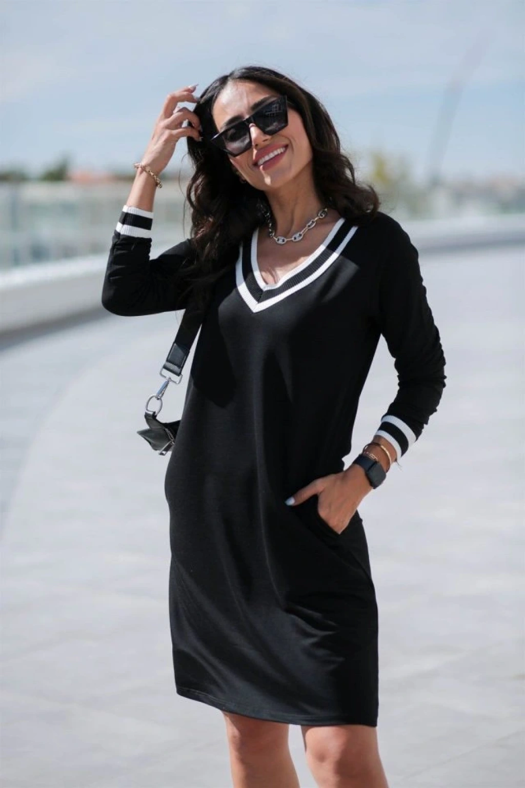 Kadın Uzun Kollu V Yaka şeritli Iki Iplik Salaş Elbise