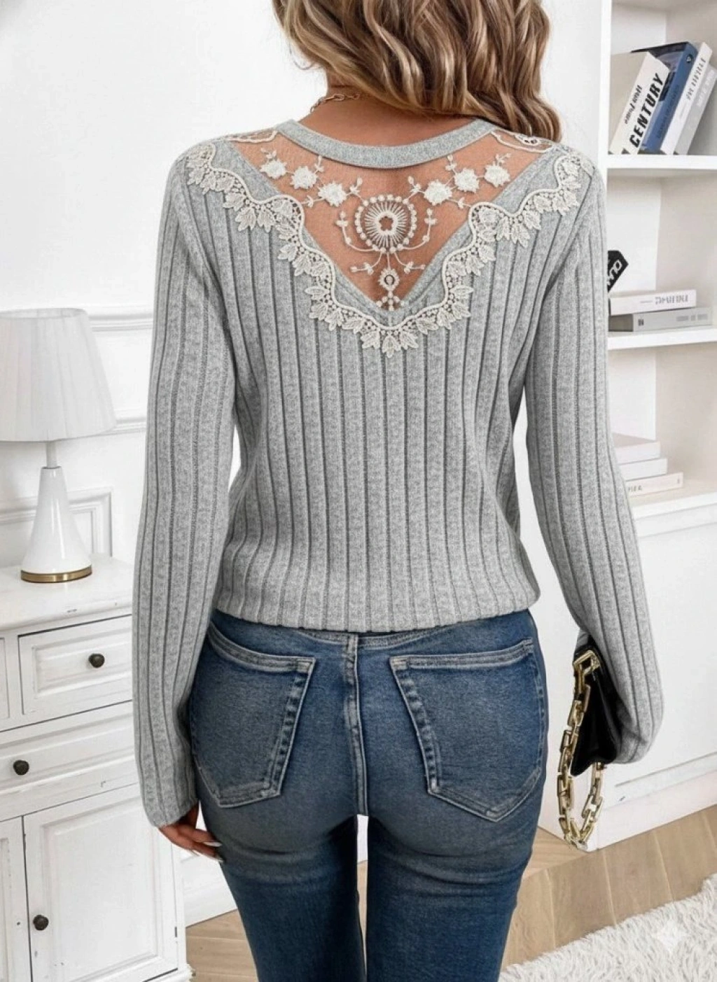 Kadın Uzun Kollu V Yakalı Arkadan Dantel Detaylı şardonlu Kaşkorse Bluz
