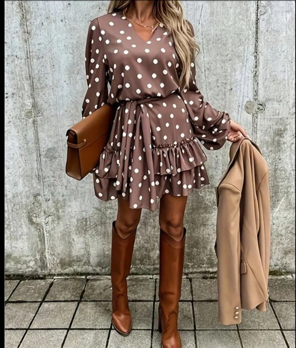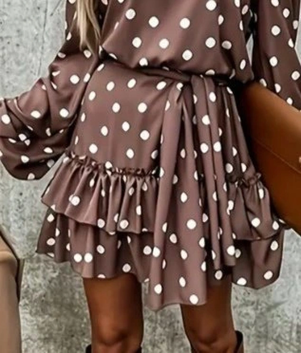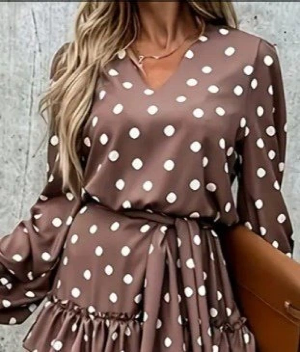 Kadın Uzun Kollu V Yakalı Belden Kuşaklı Puantiyeli Mini Modal Elbise