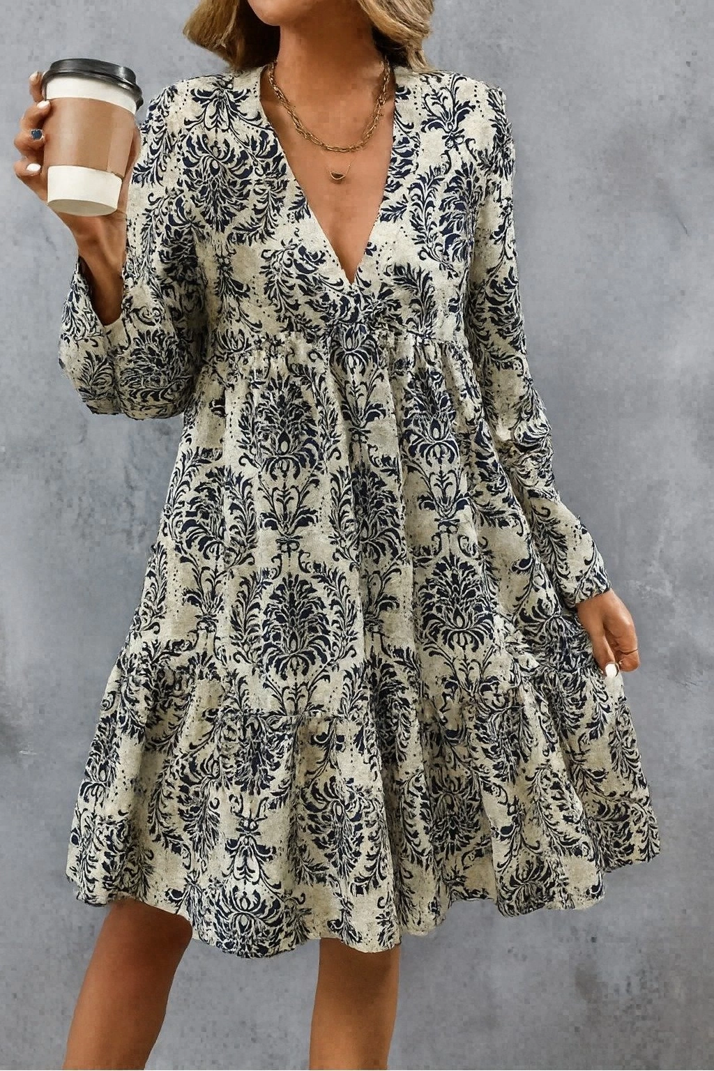 Kadın Uzun Kollu V Yakalı Fırfırlı Mini Süprem Elbise
