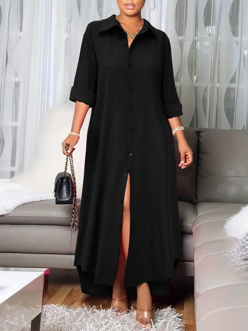 Kadın Uzun Kollu Yakalı önden Düğmeli Uzun Dokuma Elbise