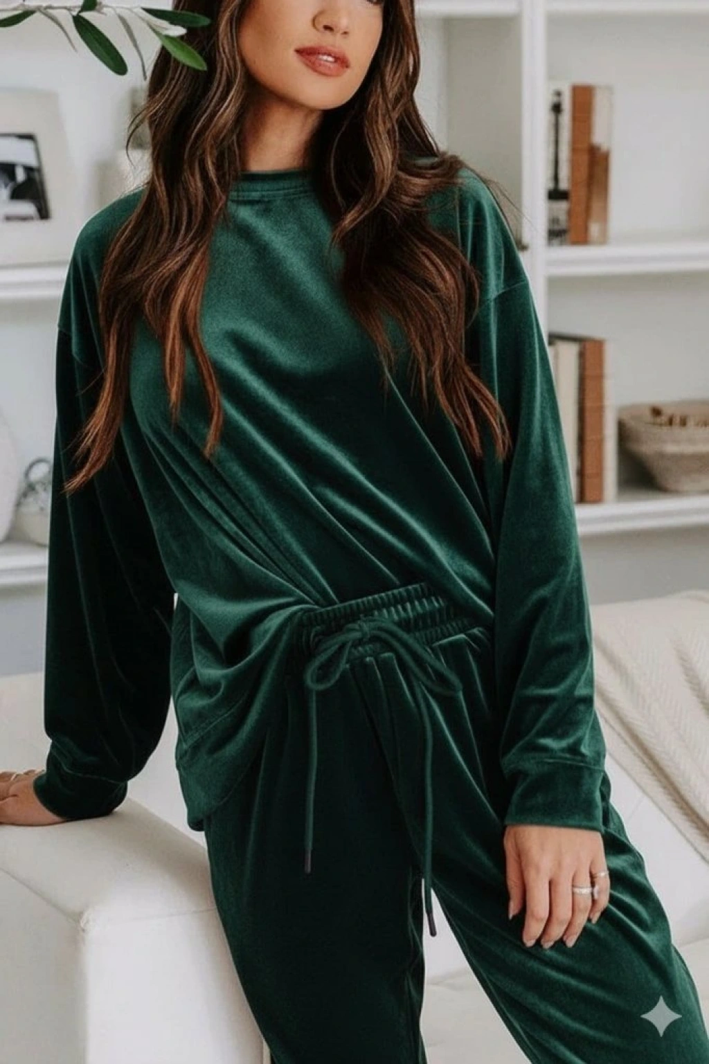 Kadın Uzun Kollu Yuvarlak Yakalı Kadife Bluz Ve Pantolon Takım