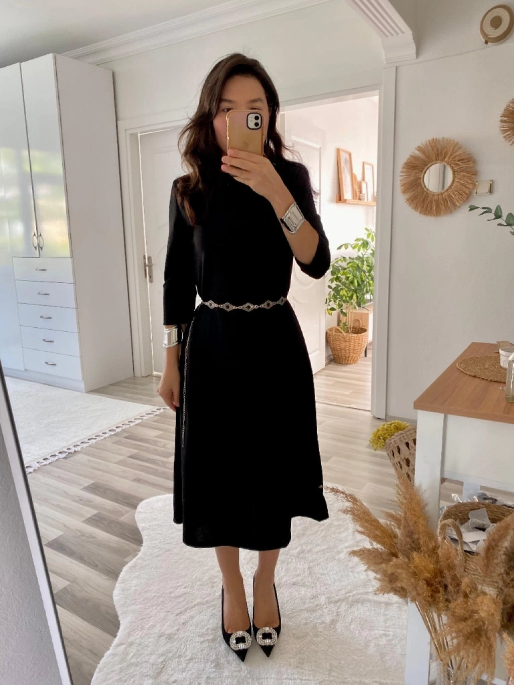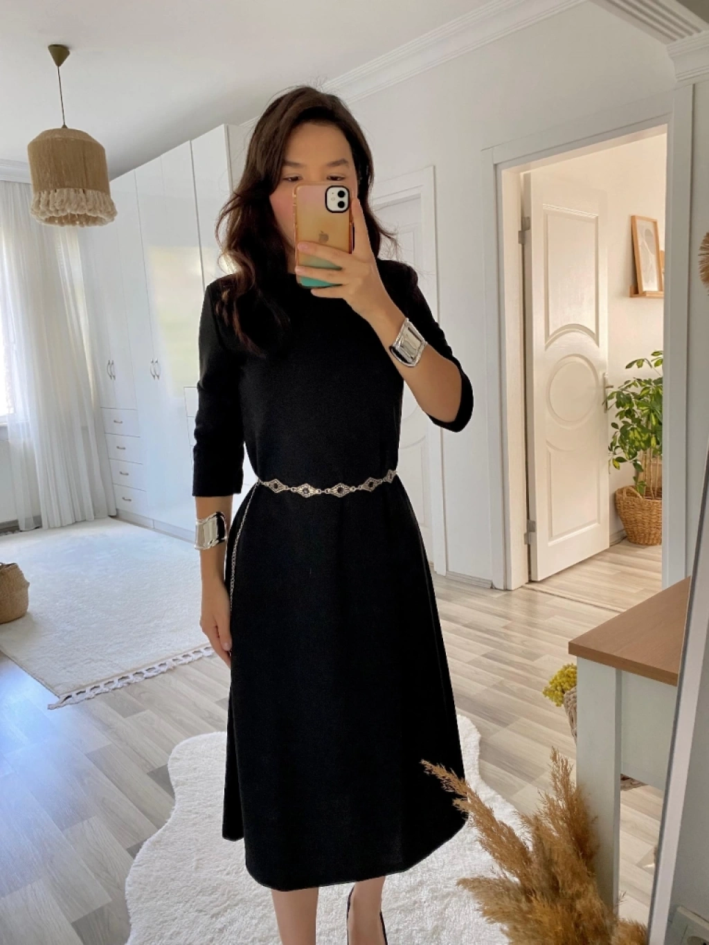 Kadın Uzun Truvakar Kol Bisiklet Yaka Midi Modal Elbise