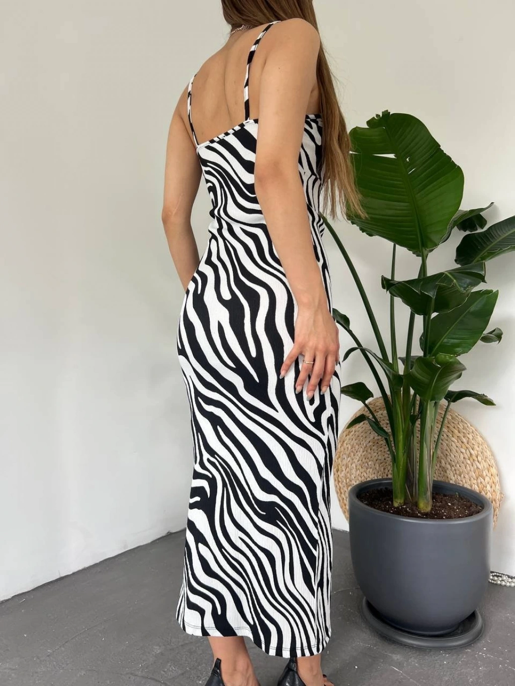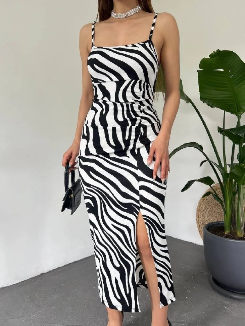 Kadın Zebra Baskılı Omuz Askılı Sırt Dekolteli Yırtmaç Detay Elbise