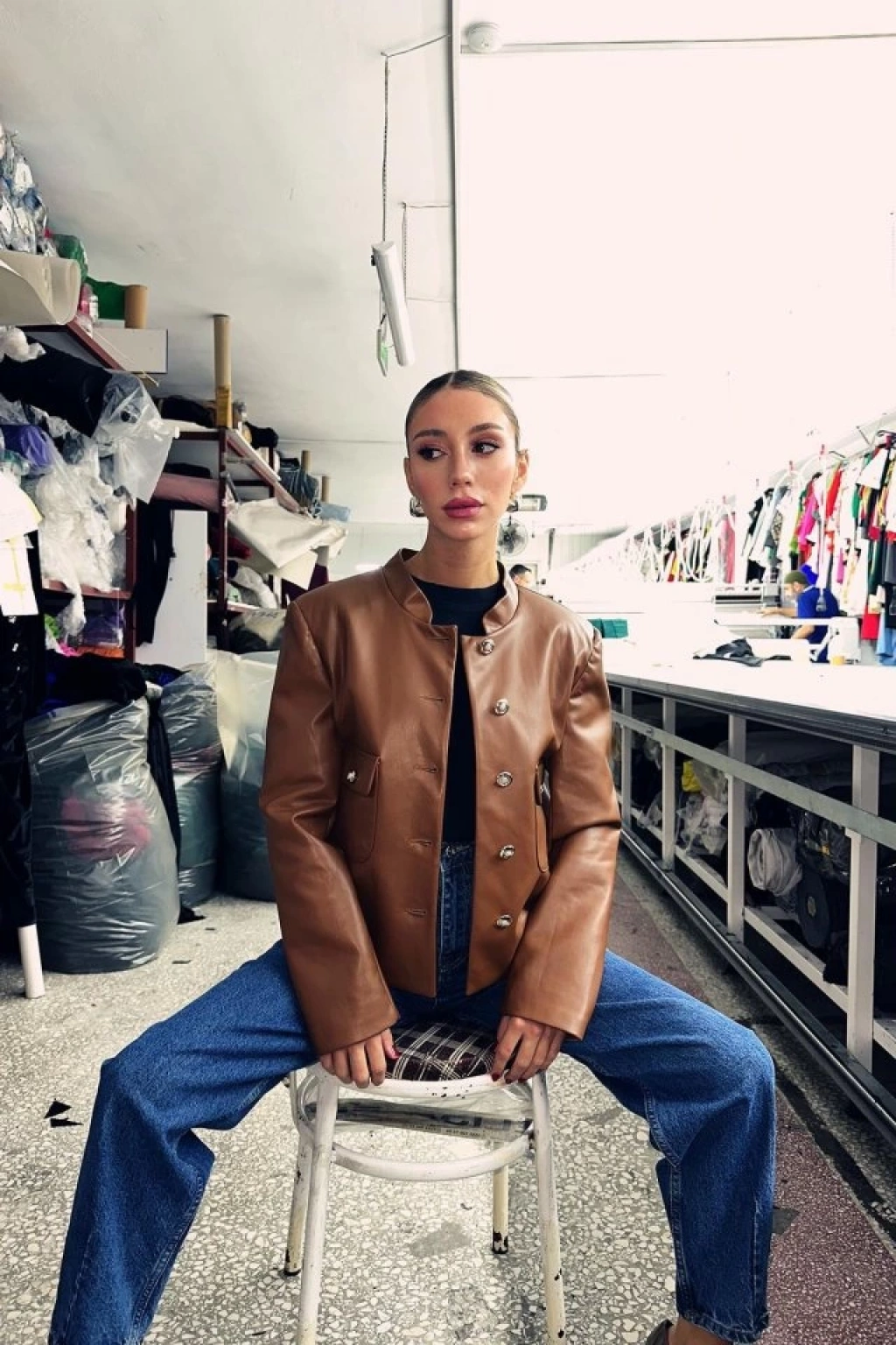 Kahverengi Önü Düğme Kapamalı Deri Ceket