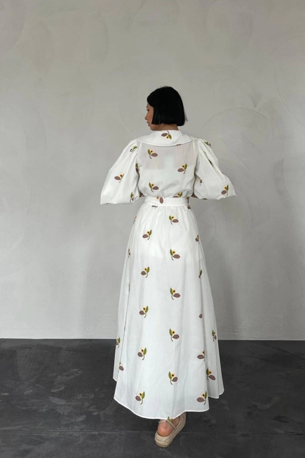Kahverengi Yakası Çiçek Motifli Kemerli Elbise