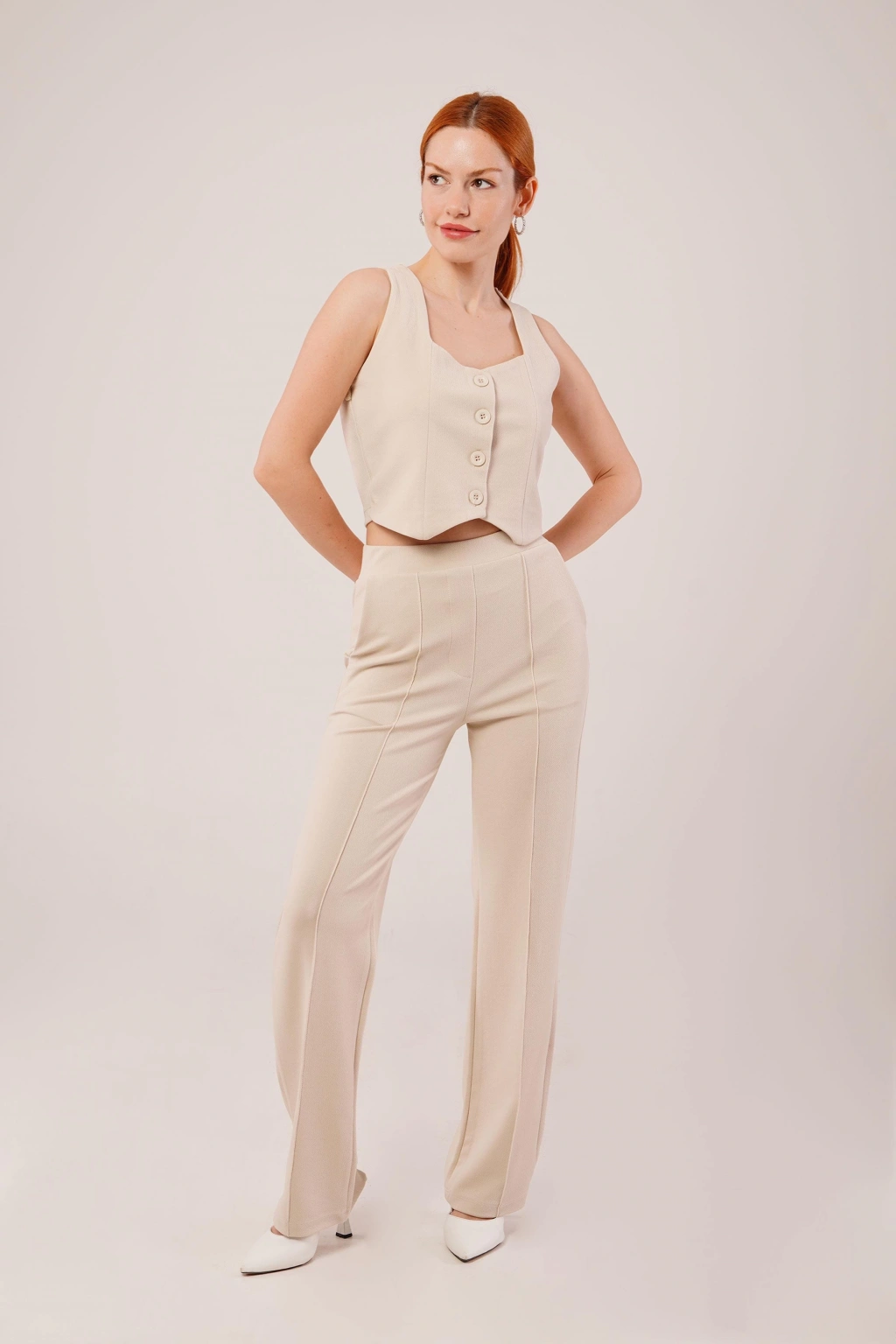 Kalın Askılı Düğmeli Yelek Ve Pantolon Bej Takım