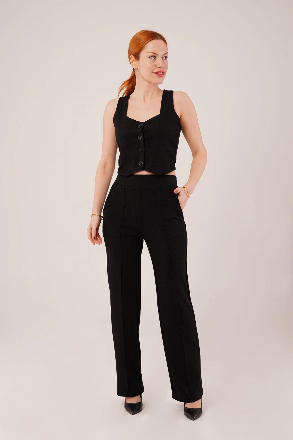 Kalın Askılı Düğmeli Yelek Ve Pantolon Siyah Takım