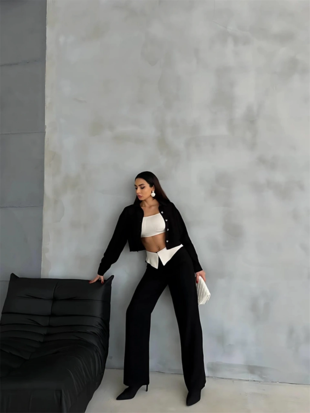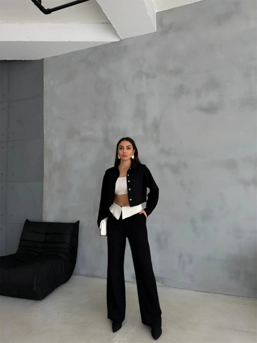 KETEN GÖMLEK-CROP-SALAŞ PANTOLON TAKIM - Siyah