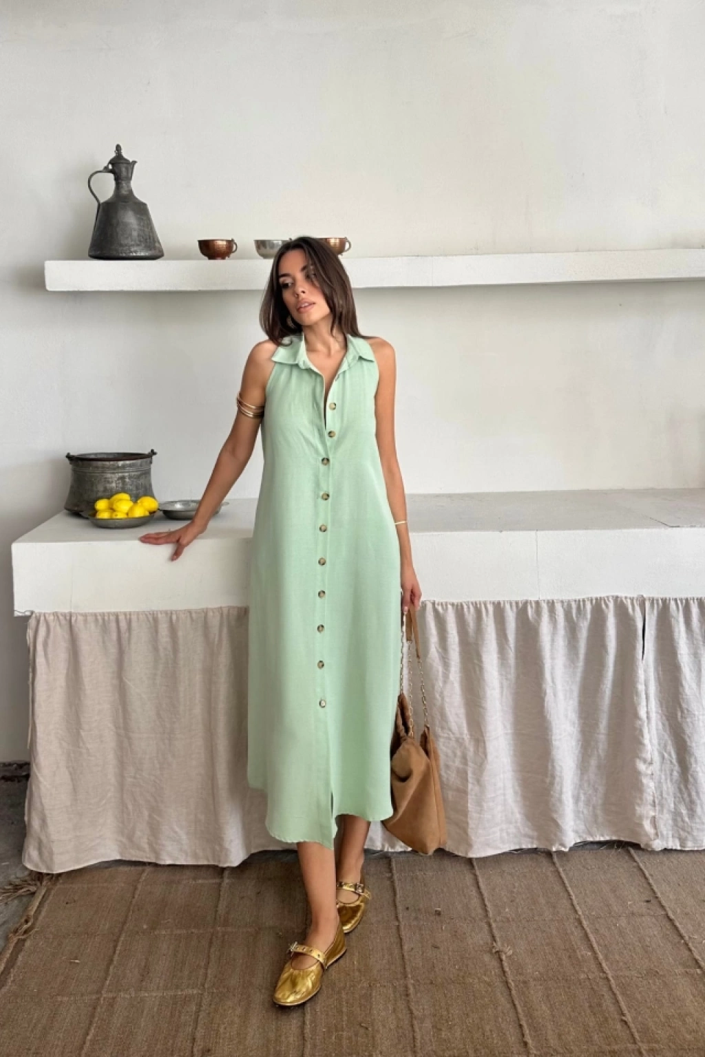 KETEN ÖNDEN DÜĞMELİ KOLSUZ GÖMLEK YAKA ELBİSE - Mint