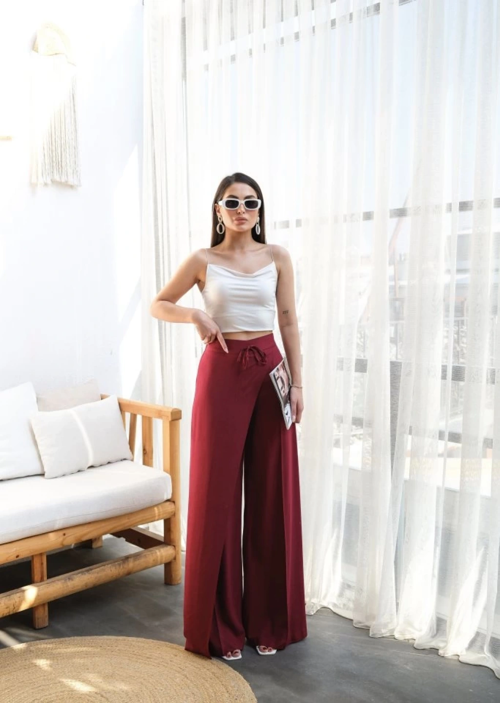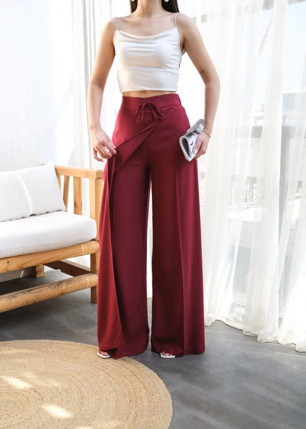 Keten Önü Çapraz Parçali Lasti̇kli̇ Ve Bağcikli Geni̇ş Paça Pantolon