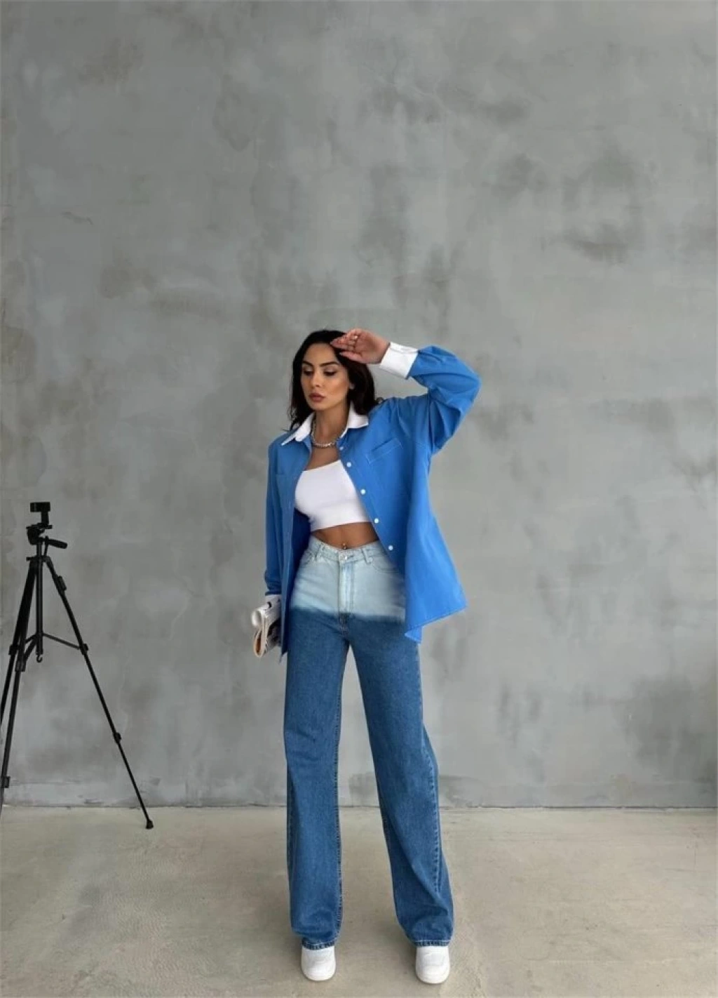 KOL VE MANŞET BEYAZ KAPALI PİLE DETAYLI GÖMLEK - Mavi