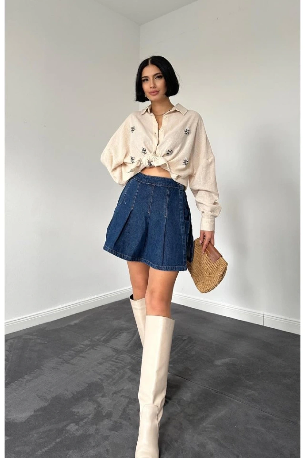 Krem Taş İşlemeli Gömlek