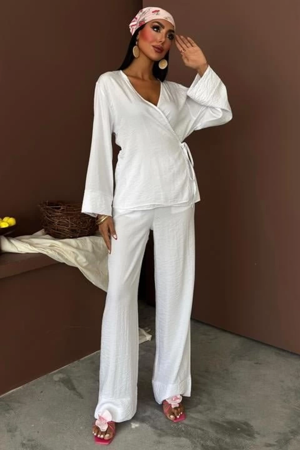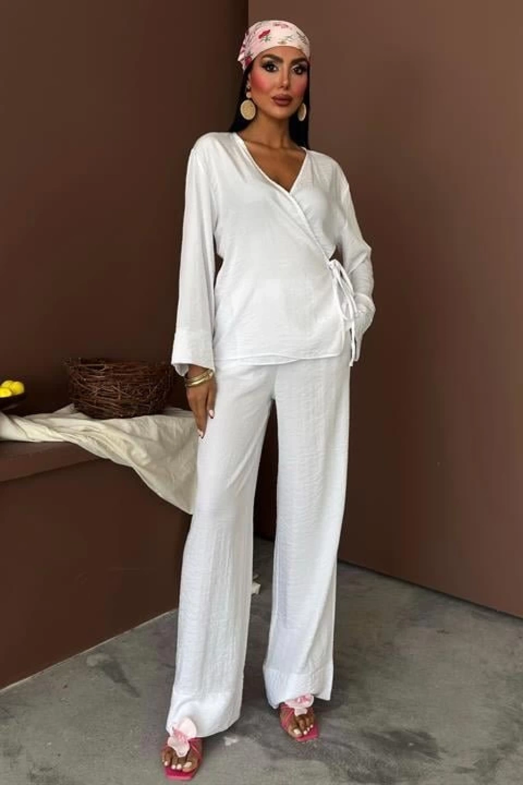 Kruvaze Model Klasik Pantolonlu Çupra Keten Takım 10191