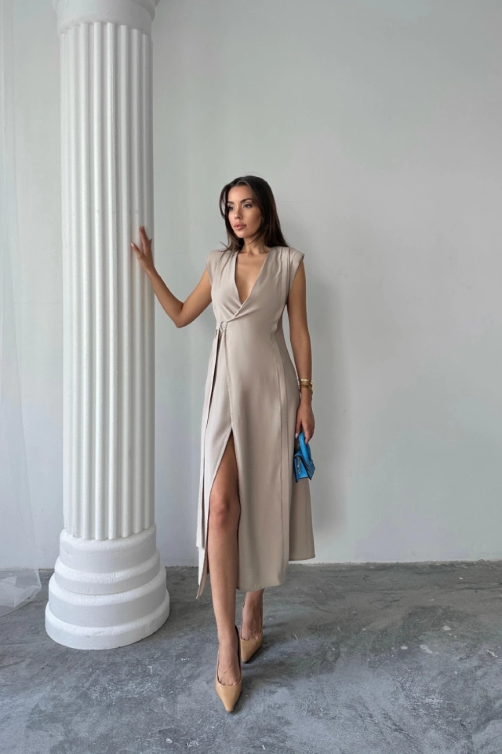 KRUVAZE VATKALI KOLSUZ ELBİSE MODAL KUMAŞ - Bej