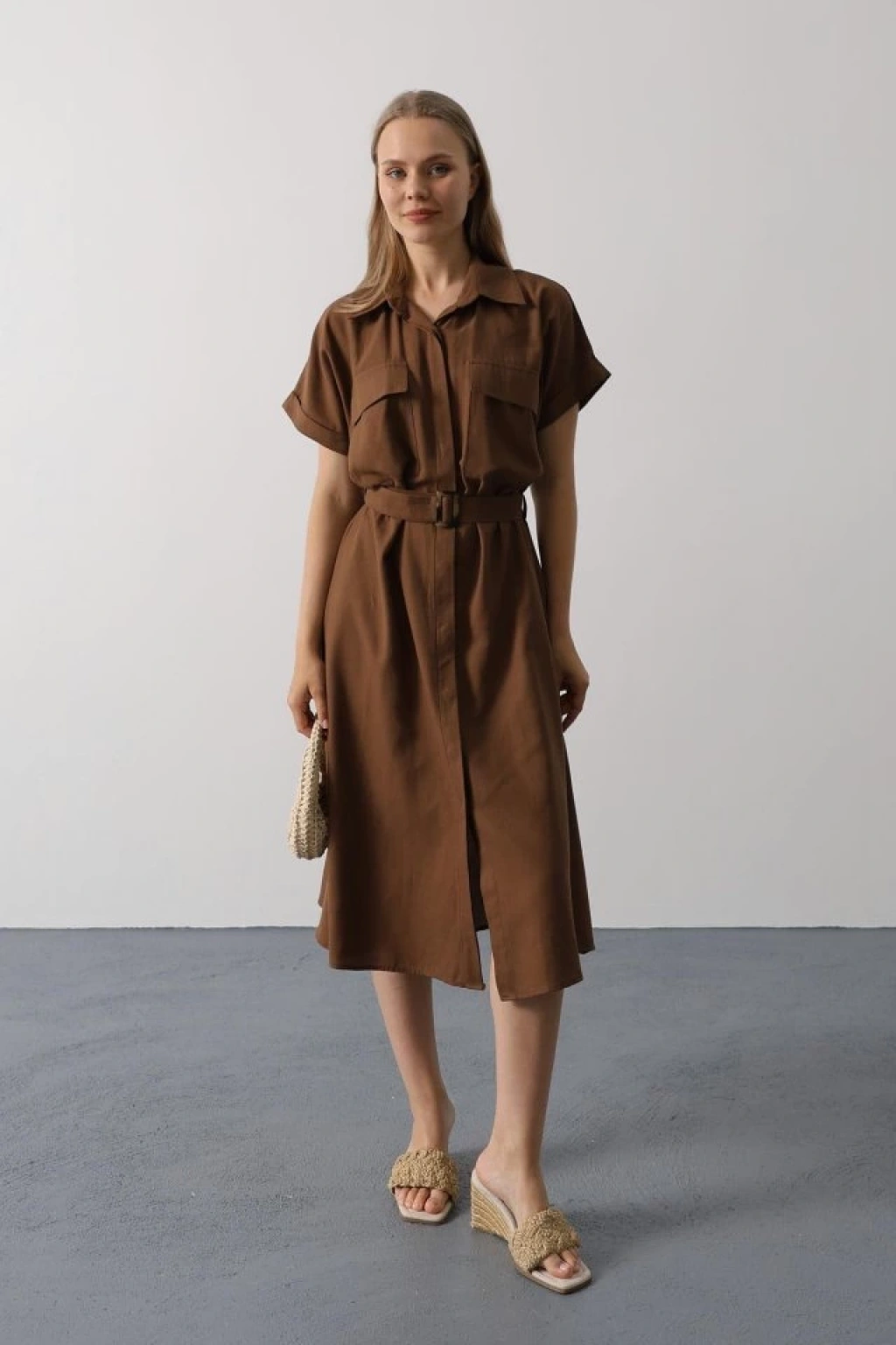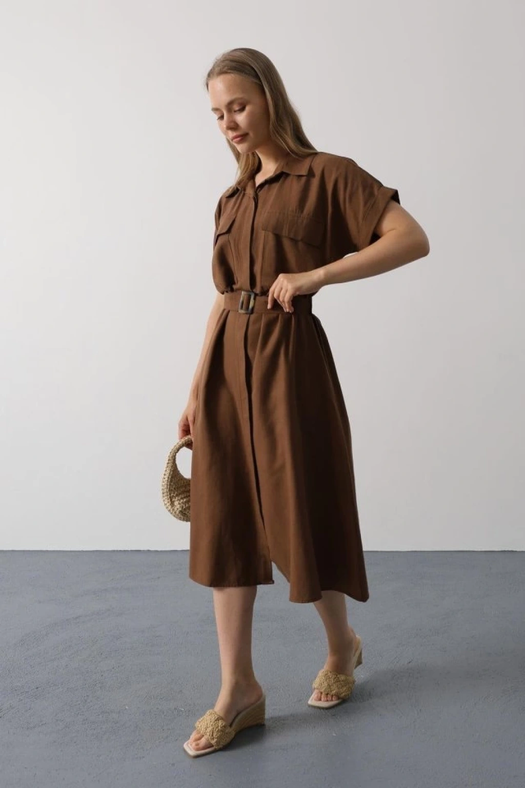 Kuşaklı Cep Detaylı Yarım Kol Elbise - Kahve