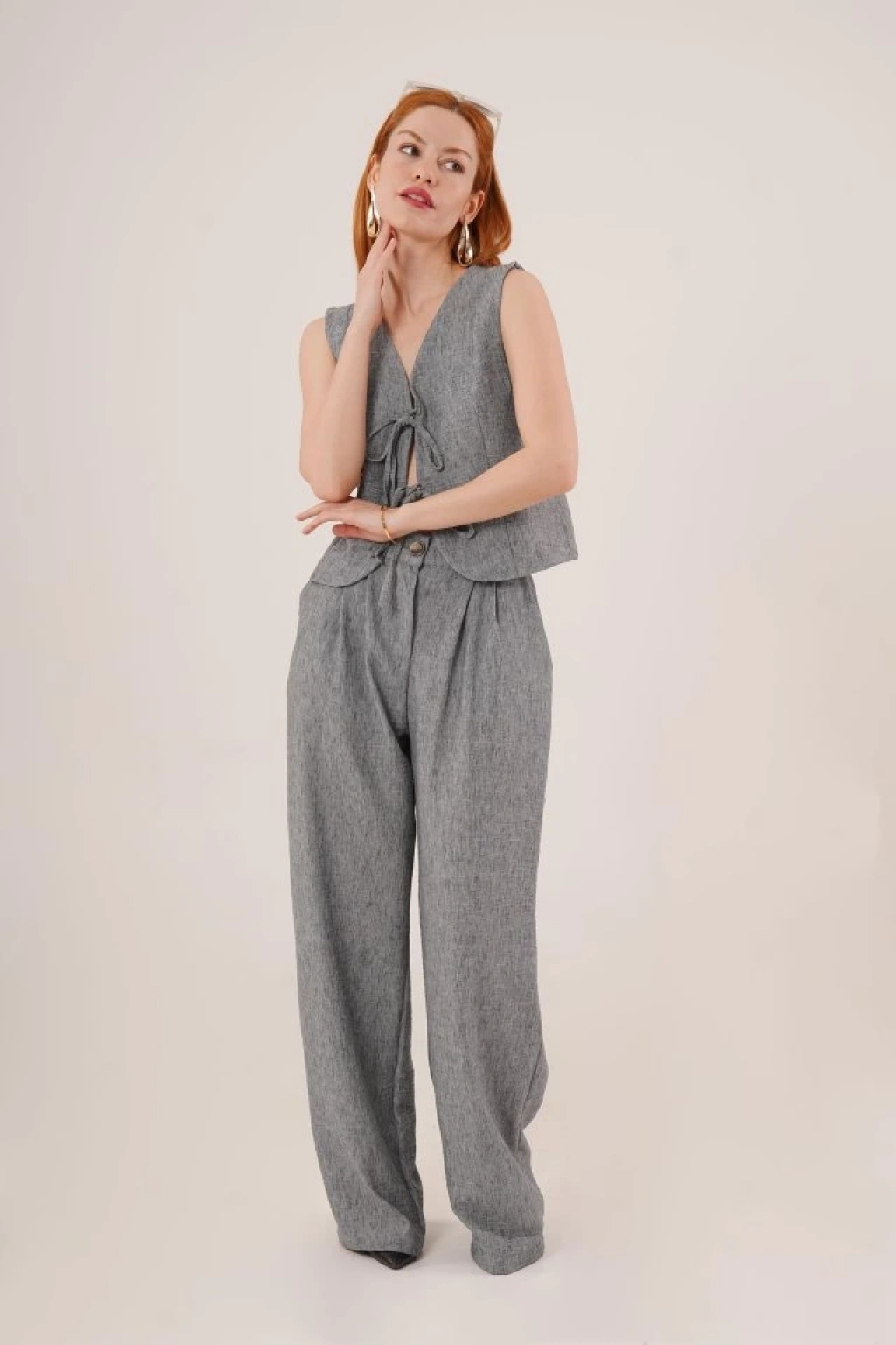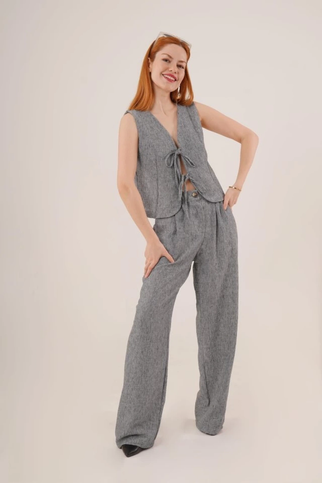 Ön Bağlama Detaylı Yelek Ve Pantolon Antrasit İkili Takım